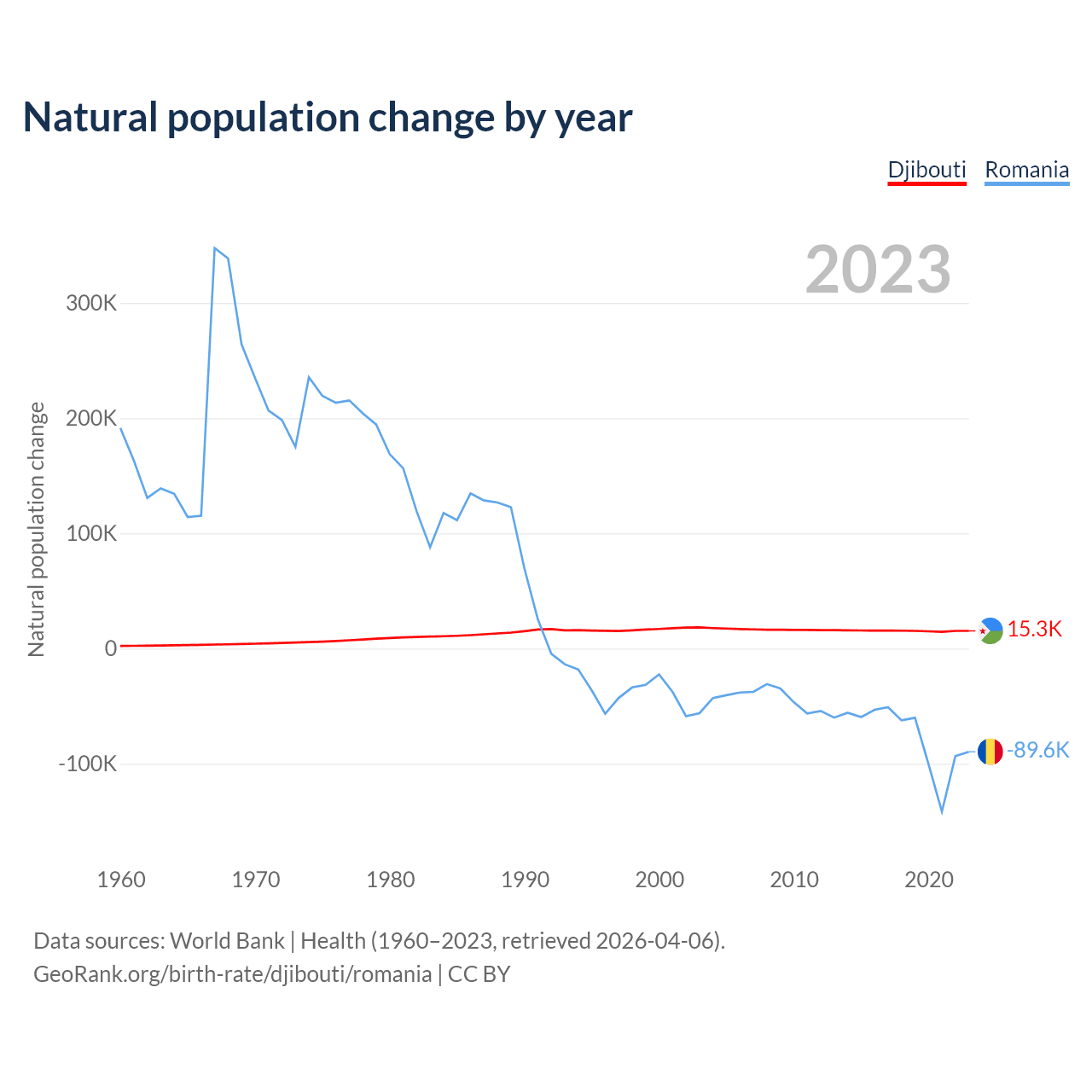 According to the latest available data on birth rates, the fertility rate in Djibouti was 2.61 children per woman in 2023, compared to 1.71 in Romania in 2023. The replacement level is considered to be 2.1 children per woman.