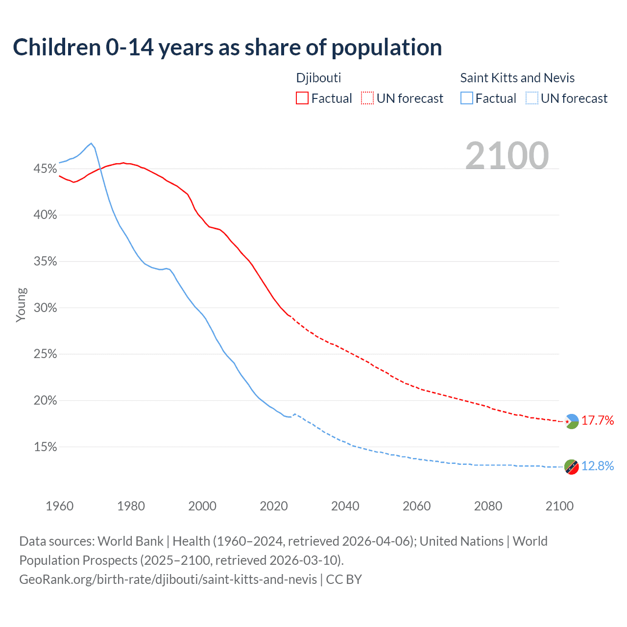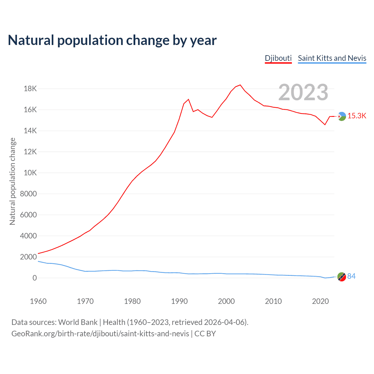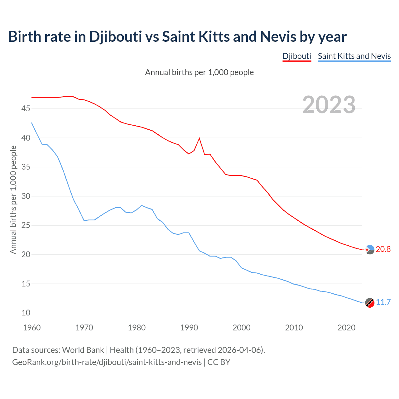 Djibouti has an annual birth rate of 20.8 births per 1,000 people, compared to 11.7 for Saint Kitts and Nevis. The average number of children a woman is expected to have during her lifetime — the fertility rate, is 2.61 in Djibouti and 1.51 in Saint Kitts and Nevis — 42.3% difference.