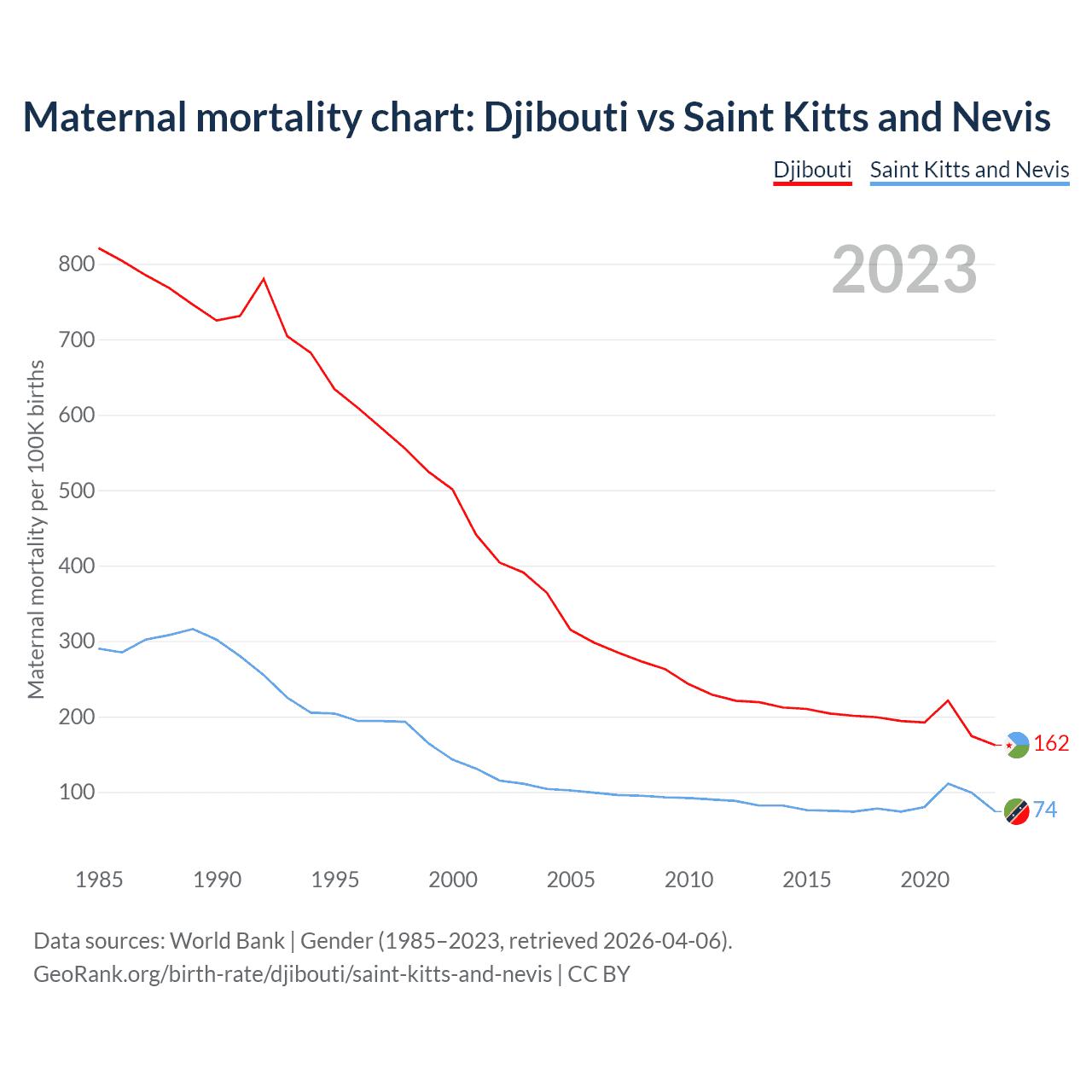 The maternal mortality rate, which is the probability of dying during childbirth or within 42 days of pregnancy termination, is 162 deaths per 100,000 live births in Djibouti, compared to 74 deaths in Saint Kitts and Nevis.