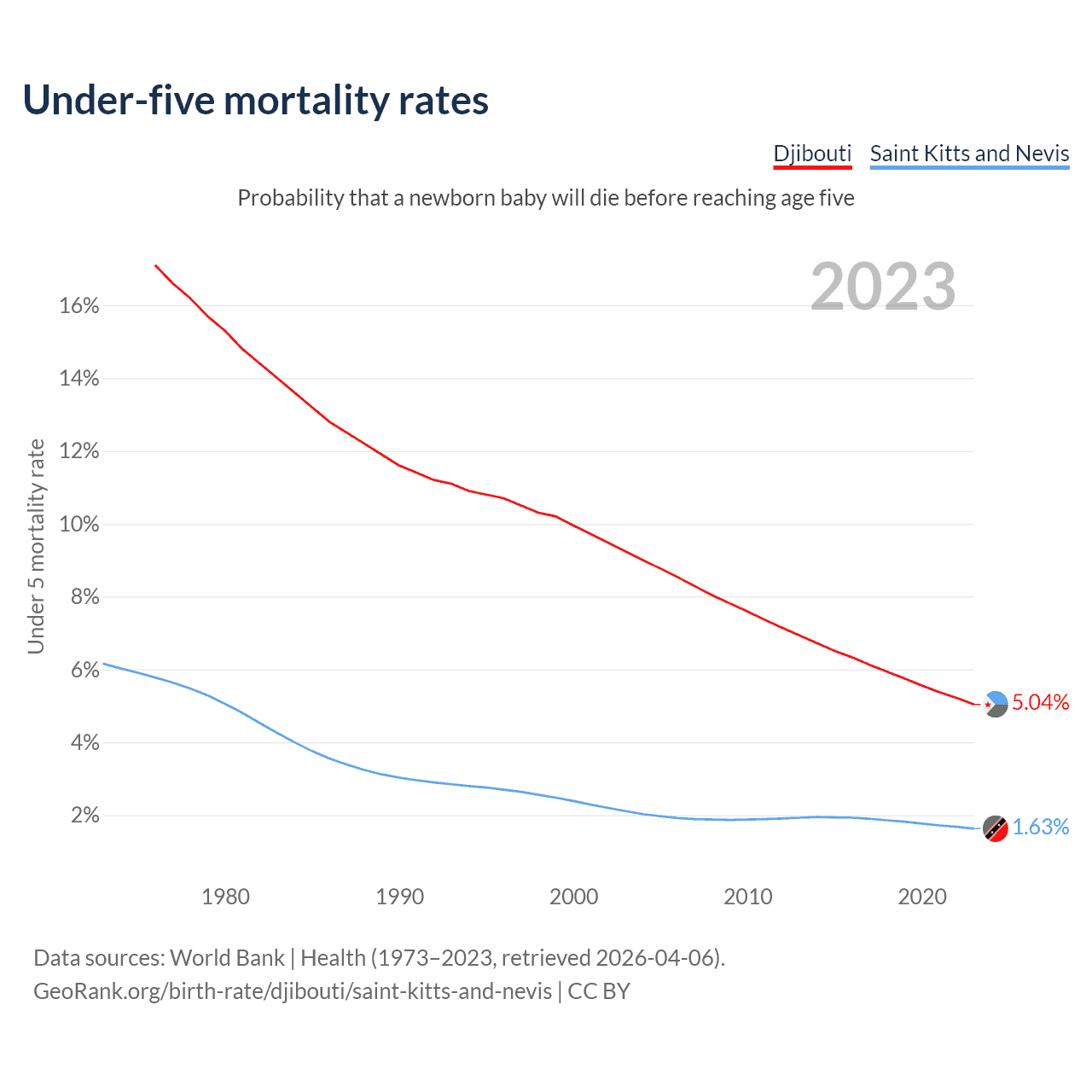 The chance that a newborn baby will die before reaching age five is 5.04% in Djibouti and 1.63% in Saint Kitts and Nevis. Above is a chart with historical data on under-five mortality rates.