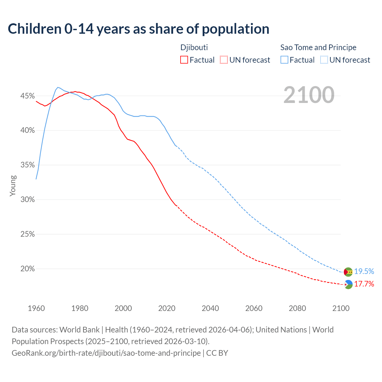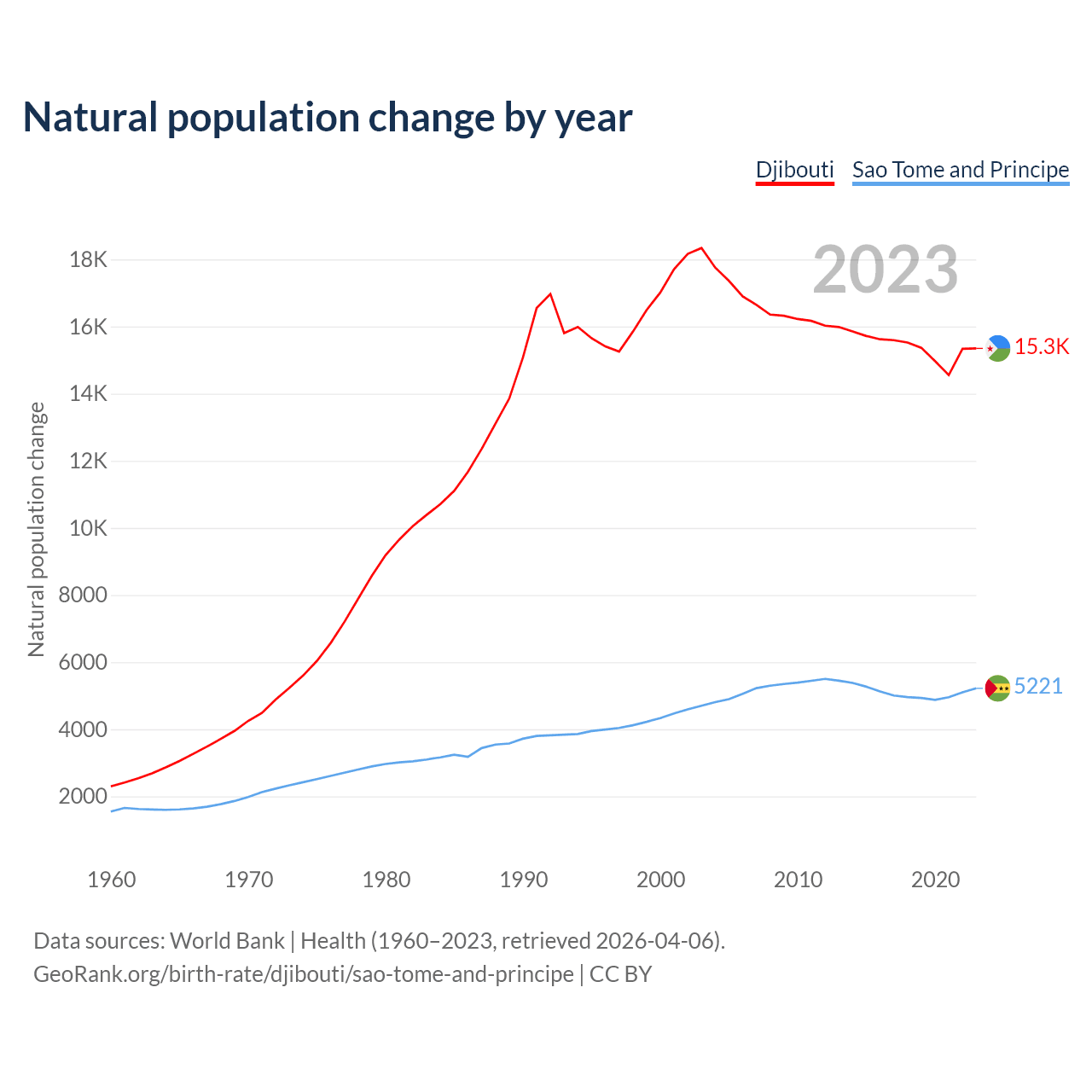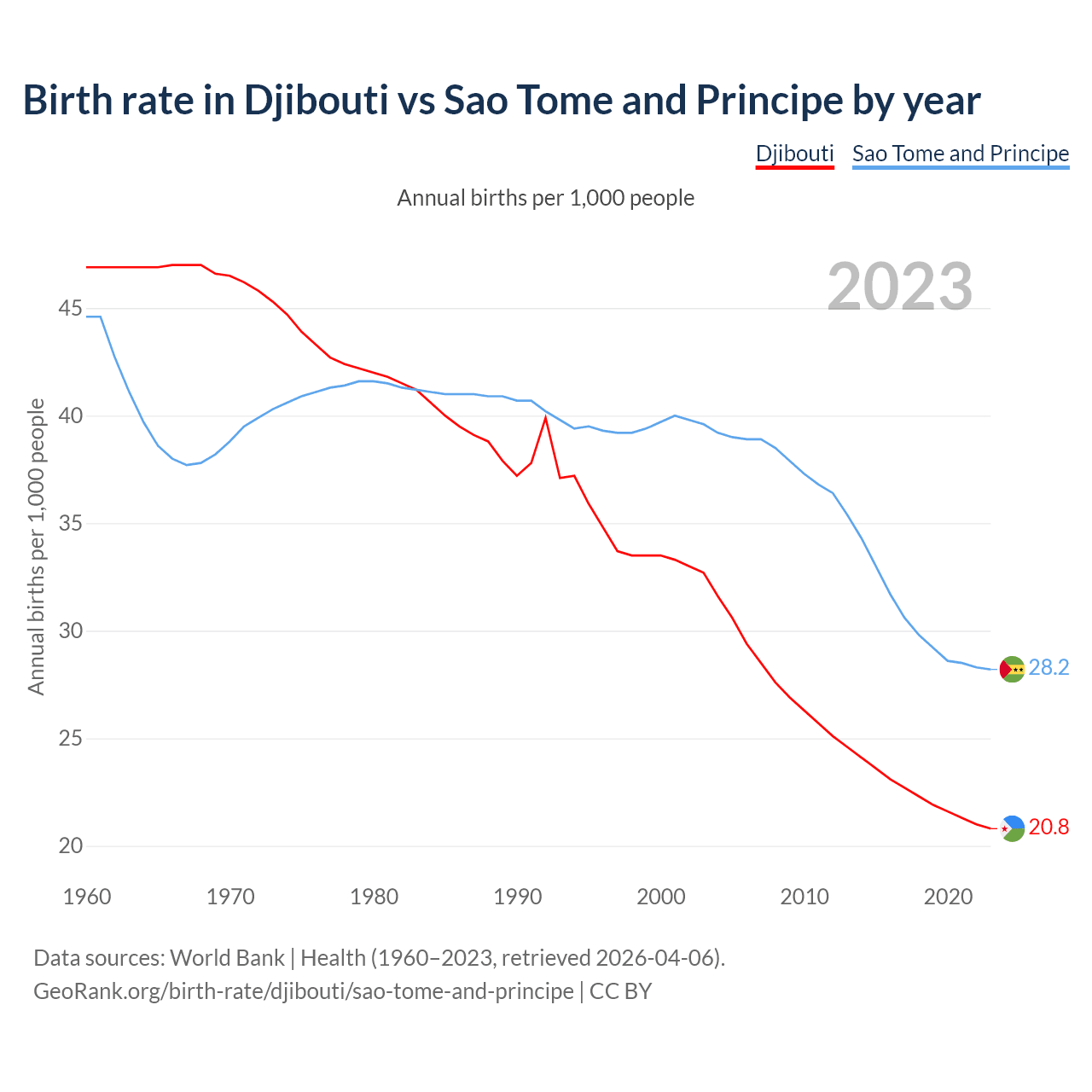 Djibouti has an annual birth rate of 20.8 births per 1,000 people, compared to 28.2 for Sao Tome and Principe. The average number of children a woman is expected to have during her lifetime — the fertility rate, is 2.61 in Djibouti and 3.64 in Sao Tome and Principe — 39.7% difference.