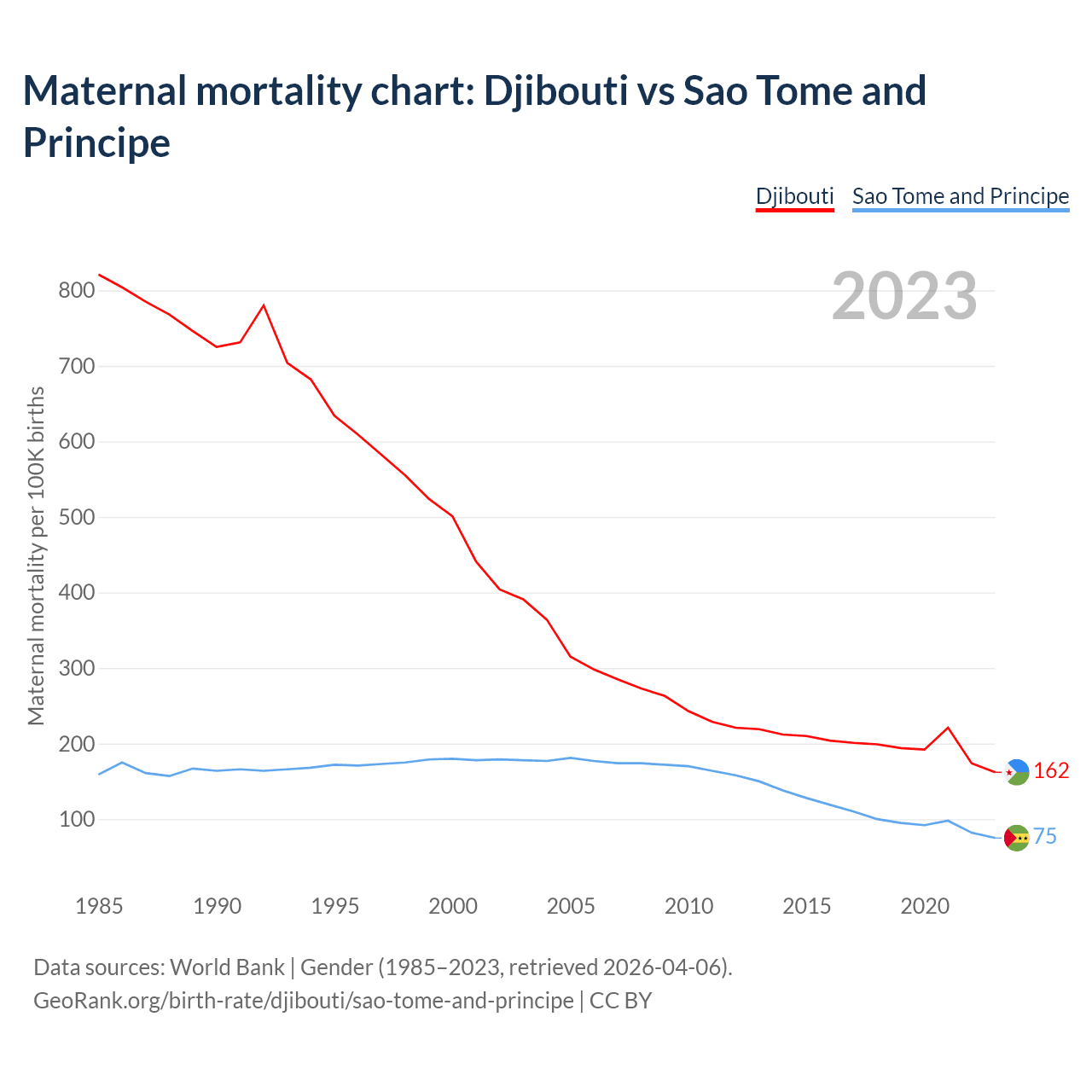 The maternal mortality rate, which is the probability of dying during childbirth or within 42 days of pregnancy termination, is 162 deaths per 100,000 live births in Djibouti, compared to 75 deaths in Sao Tome and Principe.