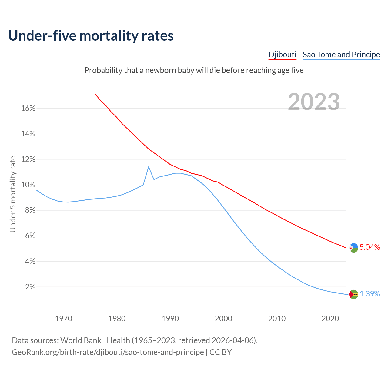 The chance that a newborn baby will die before reaching age five is 5.04% in Djibouti and 1.39% in Sao Tome and Principe. Above is a chart with historical data on under-five mortality rates.