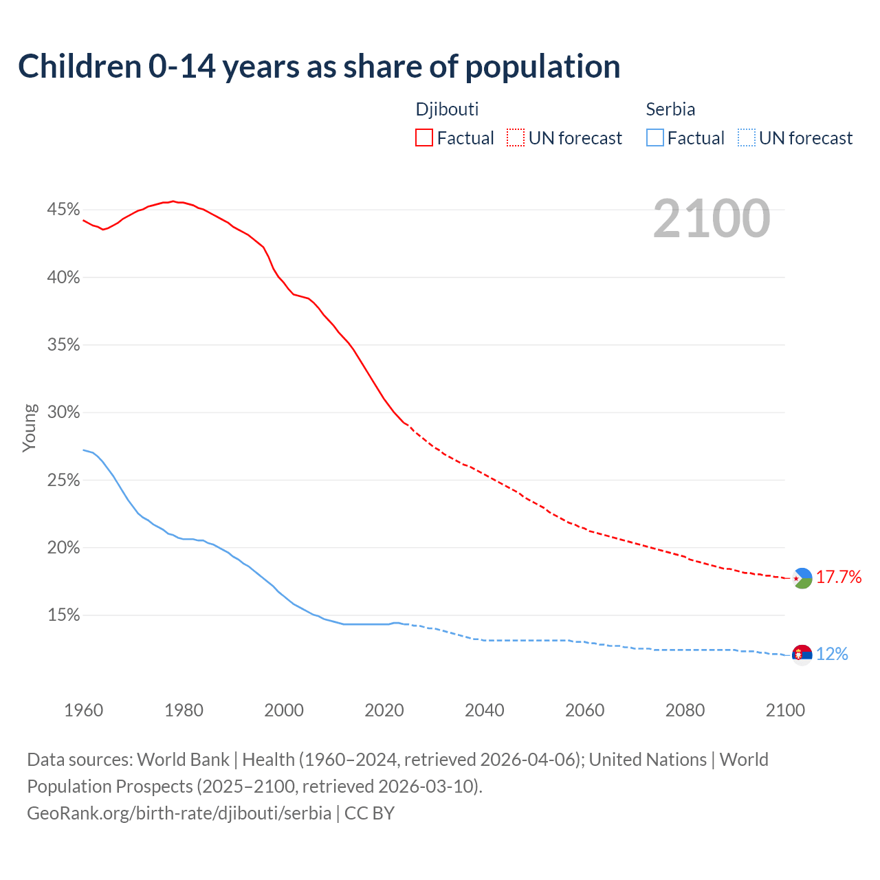 According to the latest available data on birth rates, the fertility rate in Djibouti was 2.61 children per woman in 2023, compared to 1.61 in Serbia in 2023. The replacement level is considered to be 2.1 children per woman.