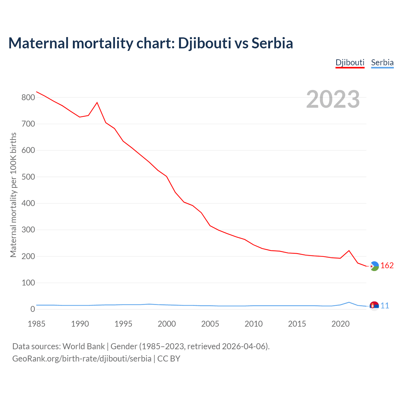 The maternal mortality rate, which is the probability of dying during childbirth or within 42 days of pregnancy termination, is 162 deaths per 100,000 live births in Djibouti, compared to 11 deaths in Serbia.