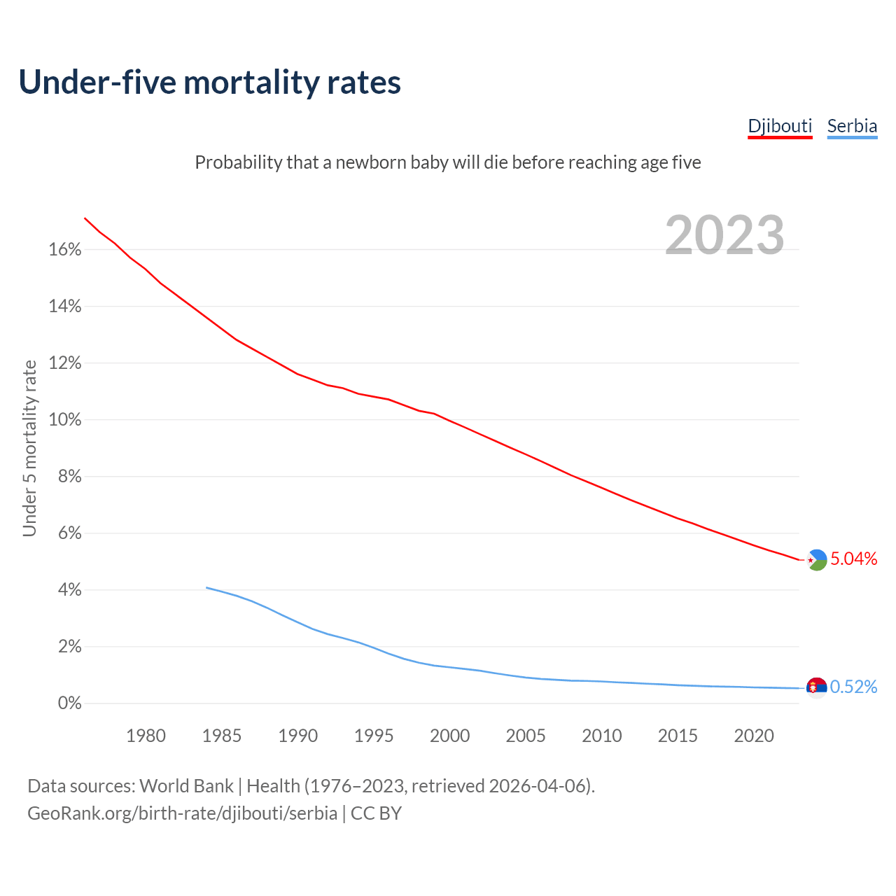 The chance that a newborn baby will die before reaching age five is 5.04% in Djibouti and 0.52% in Serbia. Above is a chart with historical data on under-five mortality rates.