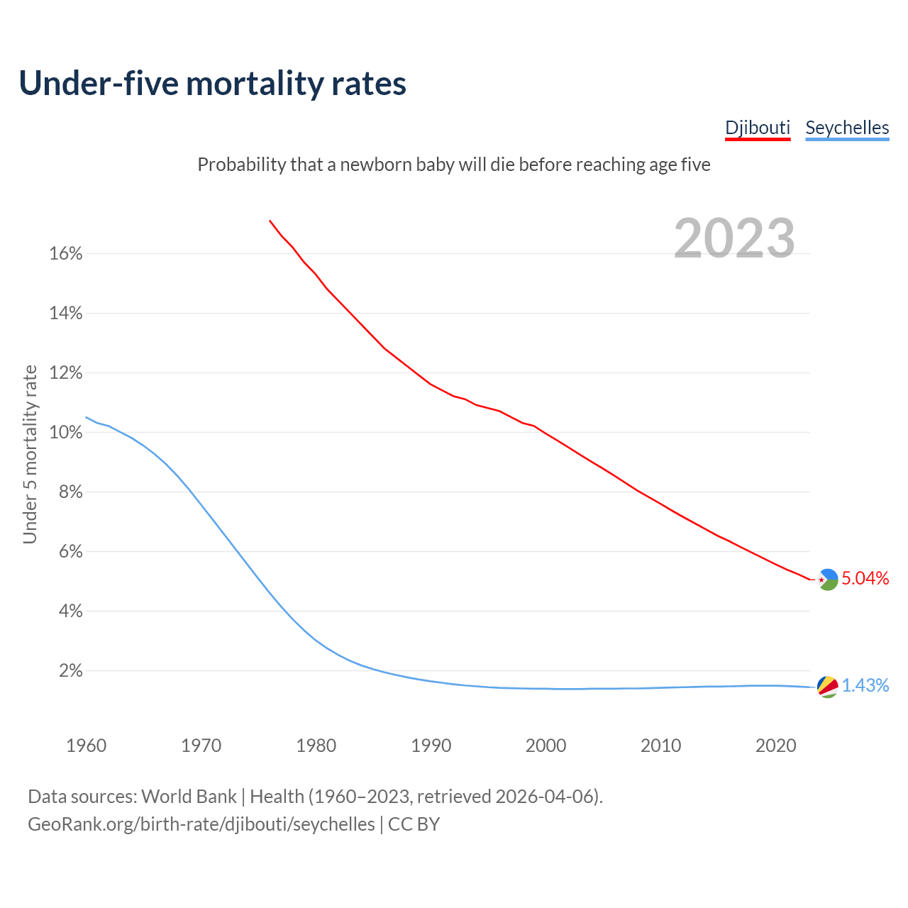 The chance that a newborn baby will die before reaching age five is 5.04% in Djibouti and 1.43% in the Seychelles. Above is a chart with historical data on under-five mortality rates.