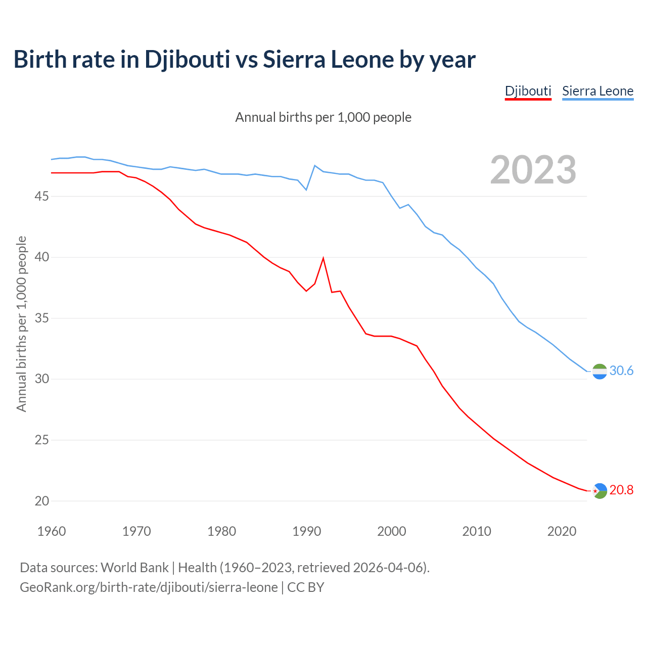 Djibouti has an annual birth rate of 20.8 births per 1,000 people, compared to 30.6 for Sierra Leone. The average number of children a woman is expected to have during her lifetime — the fertility rate, is 2.61 in Djibouti and 3.79 in Sierra Leone — 45.3% difference.