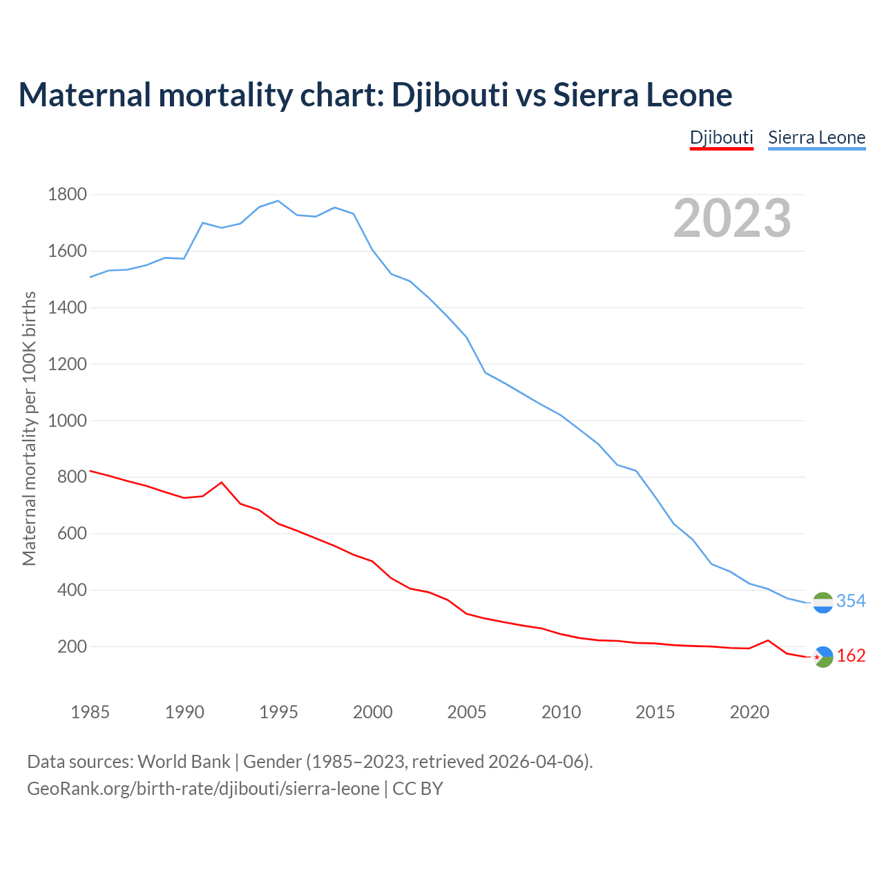 The maternal mortality rate, which is the probability of dying during childbirth or within 42 days of pregnancy termination, is 162 deaths per 100,000 live births in Djibouti, compared to 354 deaths in Sierra Leone.
