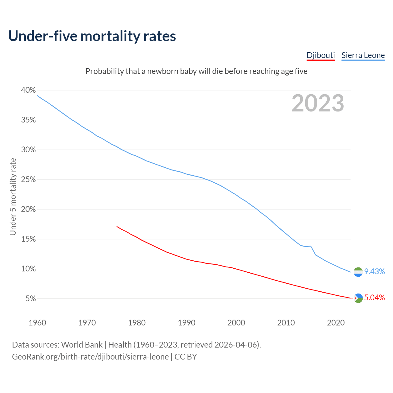 The chance that a newborn baby will die before reaching age five is 5.04% in Djibouti and 9.43% in Sierra Leone. Above is a chart with historical data on under-five mortality rates.
