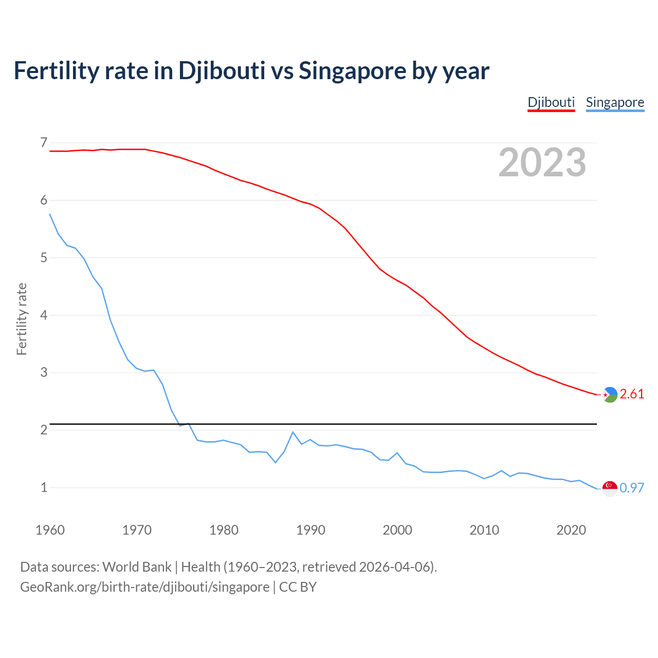According to the latest available data on birth rates, the fertility rate in Djibouti was 2.61 children per woman in 2023, compared to 0.97 in Singapore in 2023. The replacement level is considered to be 2.1 children per woman.