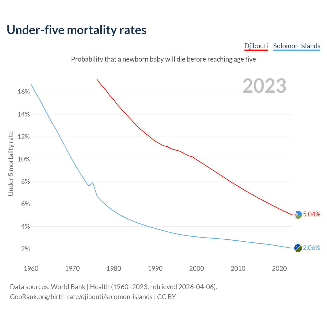 The chance that a newborn baby will die before reaching age five is 5.04% in Djibouti and 2.06% in the Solomon Islands. Above is a chart with historical data on under-five mortality rates.