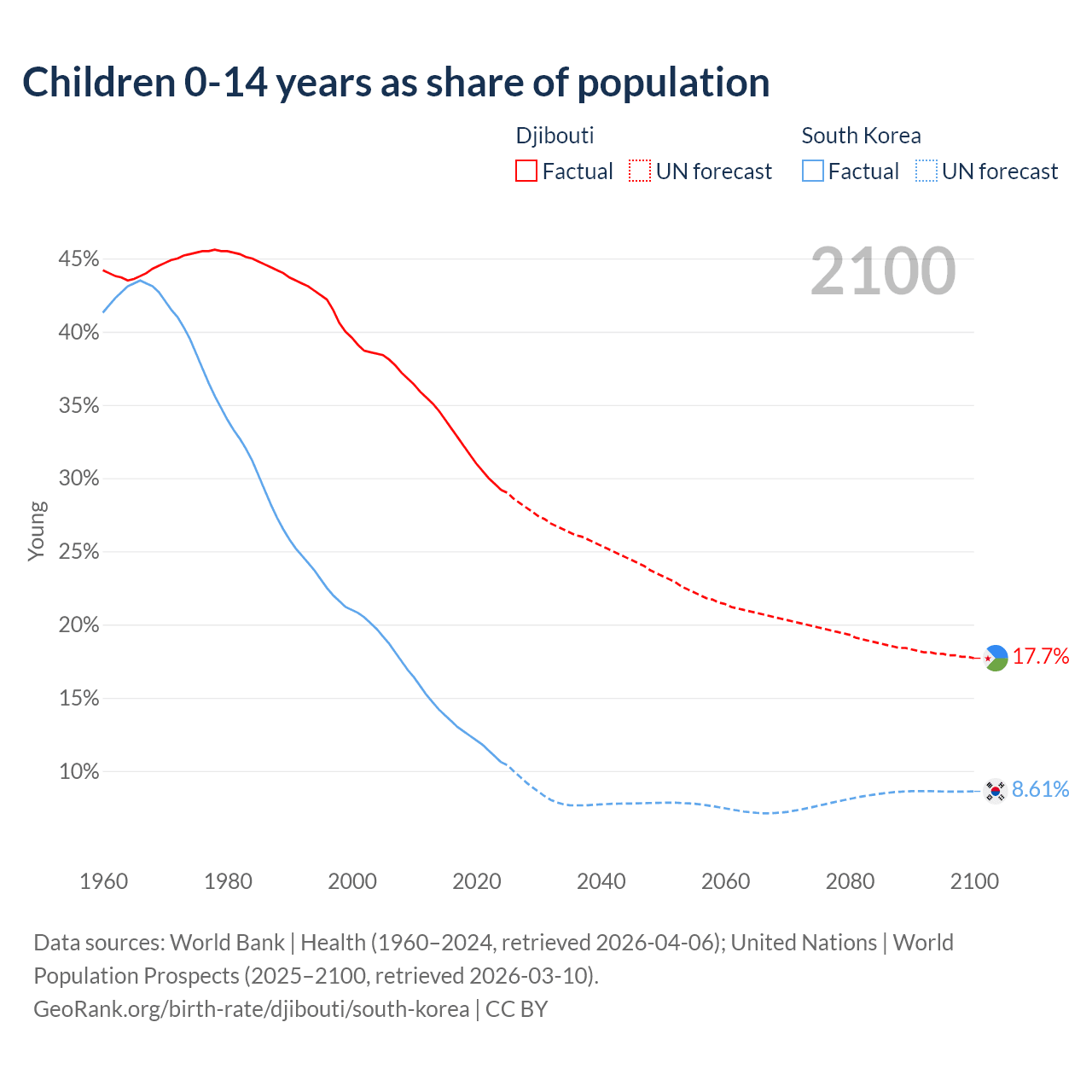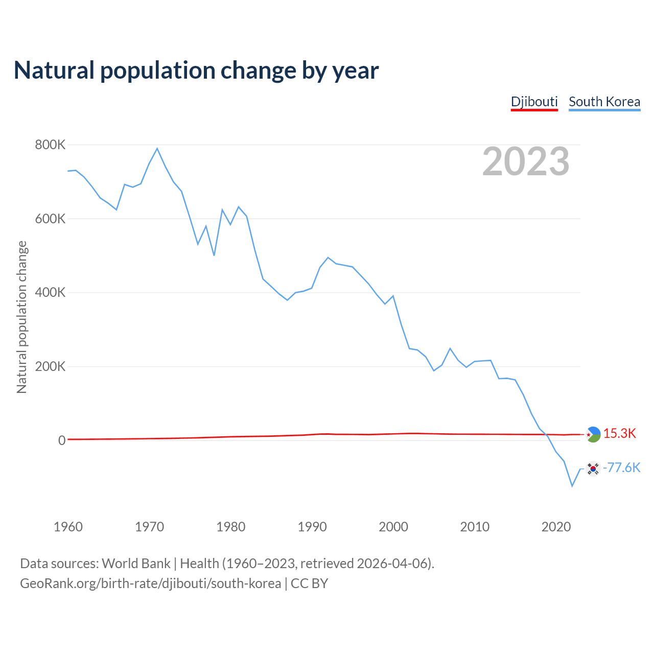 According to the latest available data on birth rates, the fertility rate in Djibouti was 2.61 children per woman in 2023, compared to 0.72 in South Korea in 2023. The replacement level is considered to be 2.1 children per woman.
