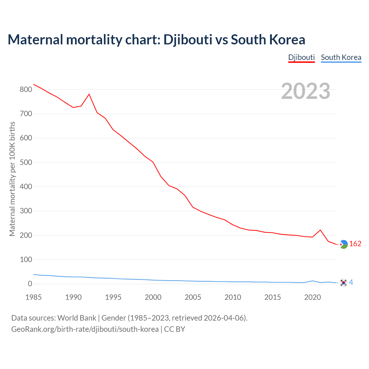 The maternal mortality rate, which is the probability of dying during childbirth or within 42 days of pregnancy termination, is 162 deaths per 100,000 live births in Djibouti, compared to 4 deaths in South Korea.