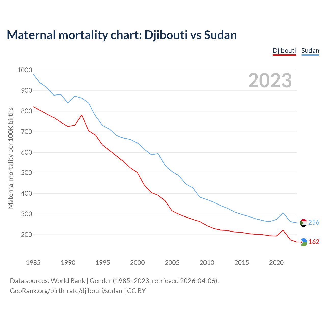 The maternal mortality rate, which is the probability of dying during childbirth or within 42 days of pregnancy termination, is 162 deaths per 100,000 live births in Djibouti, compared to 256 deaths in Sudan.