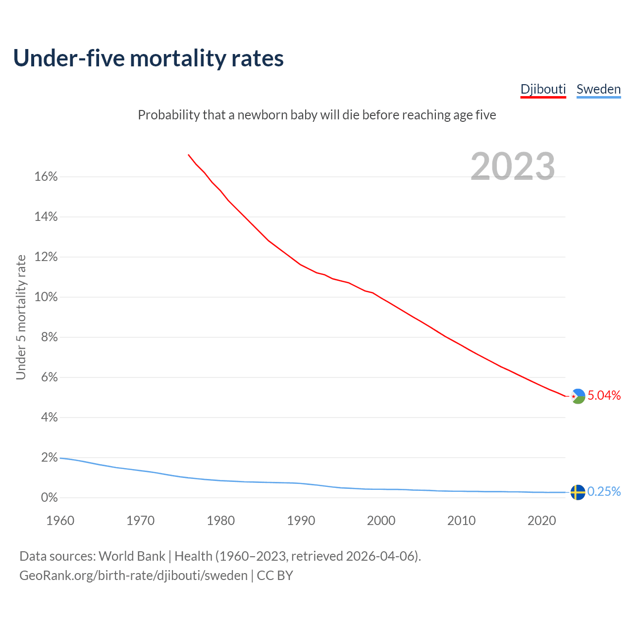 The chance that a newborn baby will die before reaching age five is 5.04% in Djibouti and 0.25% in Sweden. Above is a chart with historical data on under-five mortality rates.
