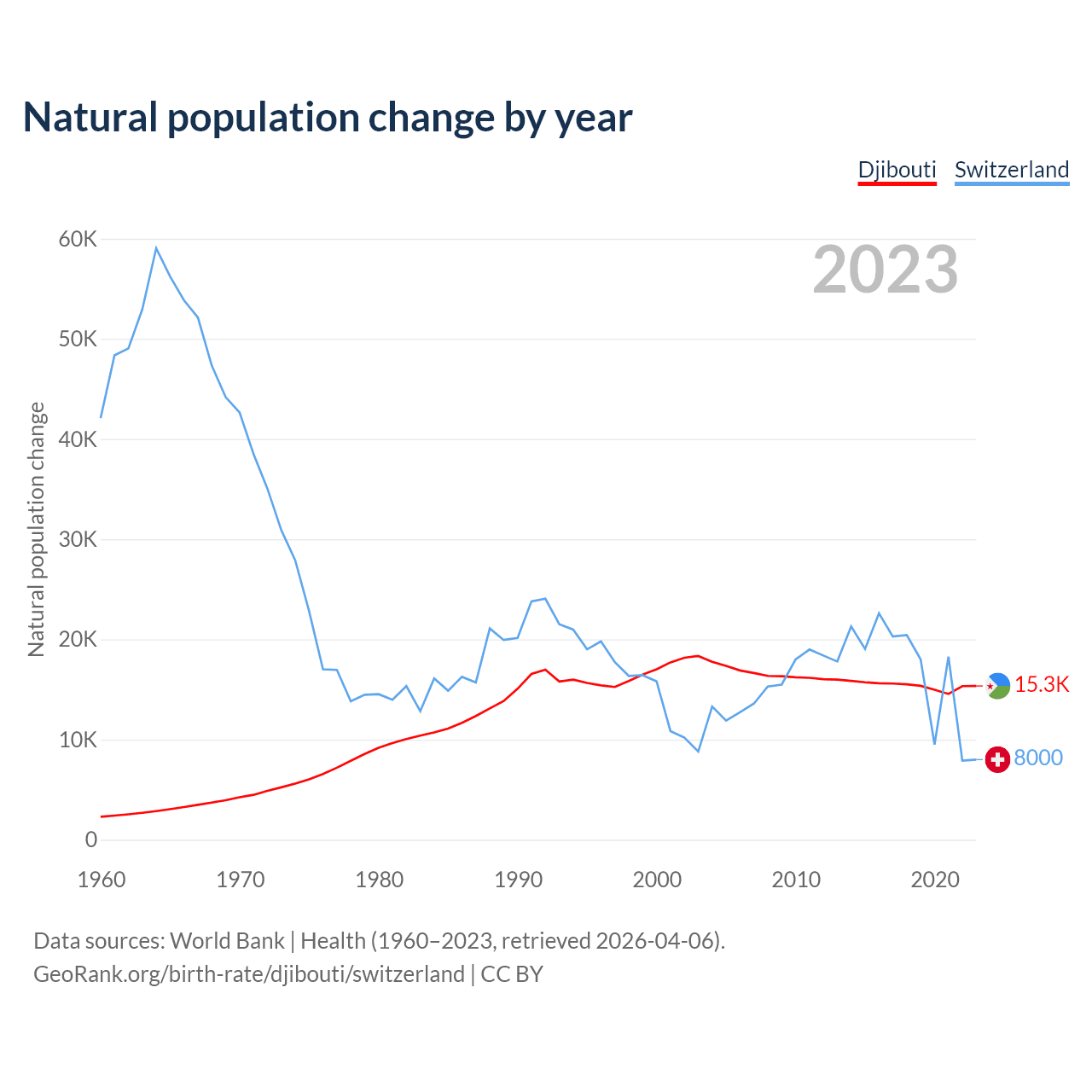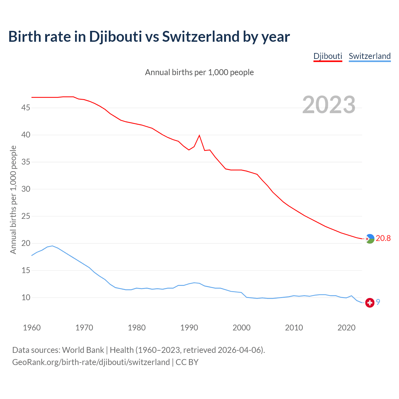 Djibouti has an annual birth rate of 20.8 births per 1,000 people, compared to 9 for Switzerland. The average number of children a woman is expected to have during her lifetime — the fertility rate, is 2.61 in Djibouti and 1.33 in Switzerland — 49% difference.