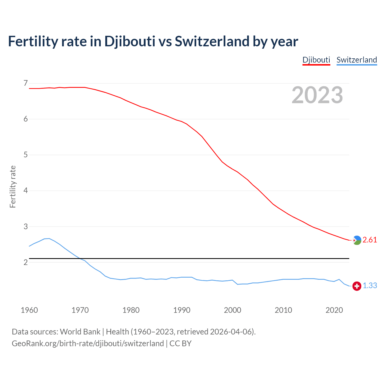 According to the latest available data on birth rates, the fertility rate in Djibouti was 2.61 children per woman in 2023, compared to 1.33 in Switzerland in 2023. The replacement level is considered to be 2.1 children per woman.