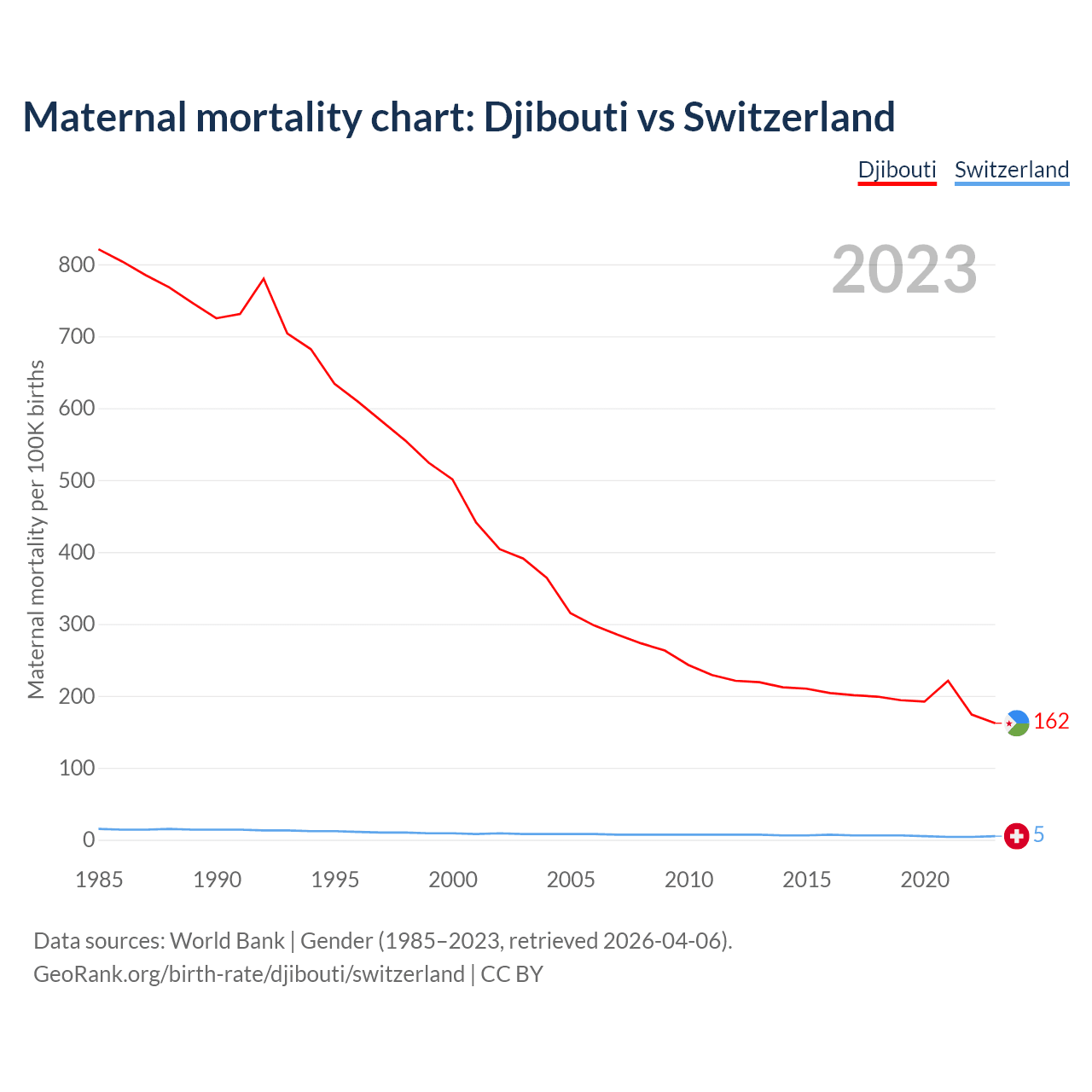 The maternal mortality rate, which is the probability of dying during childbirth or within 42 days of pregnancy termination, is 162 deaths per 100,000 live births in Djibouti, compared to 5 deaths in Switzerland.