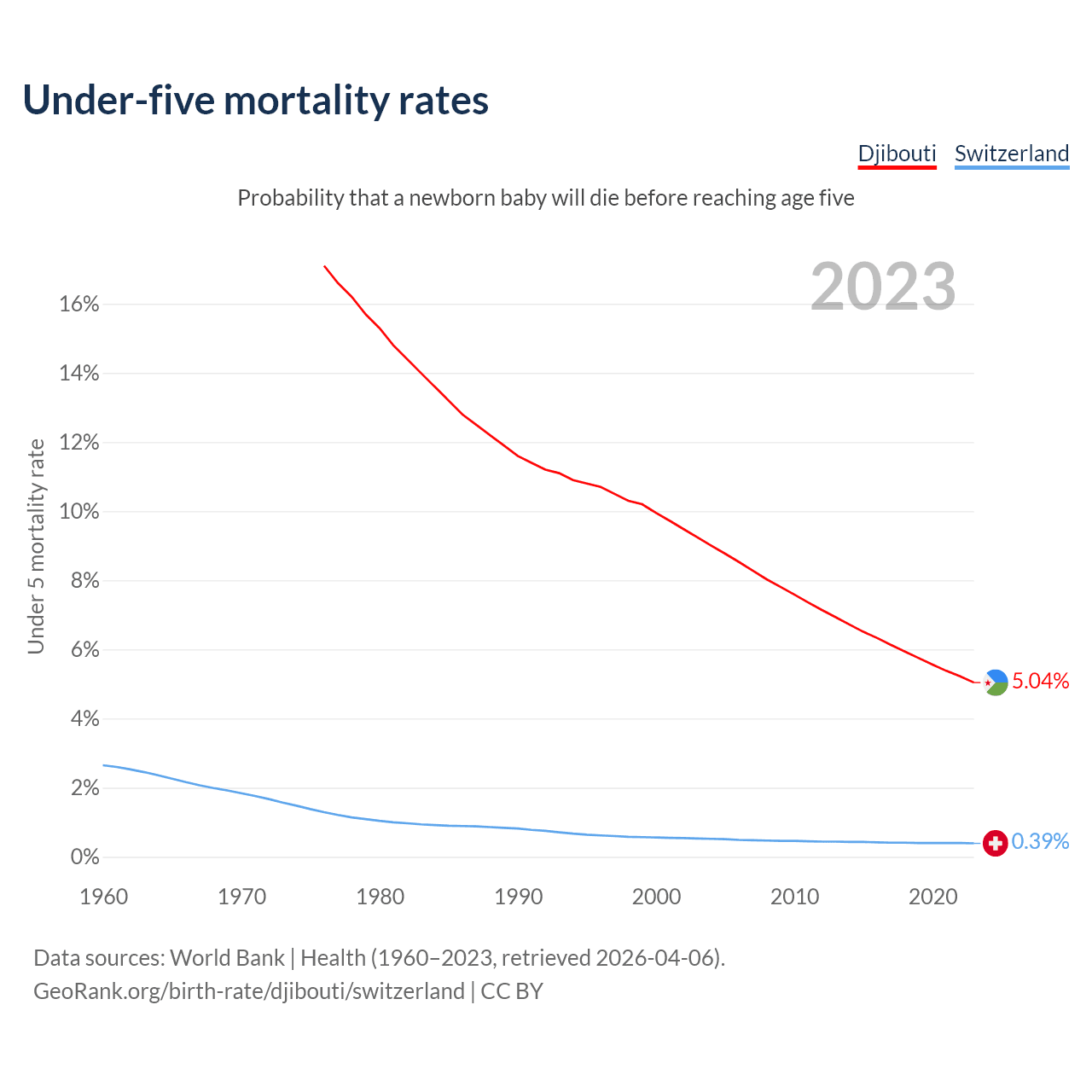 The chance that a newborn baby will die before reaching age five is 5.04% in Djibouti and 0.39% in Switzerland. Above is a chart with historical data on under-five mortality rates.