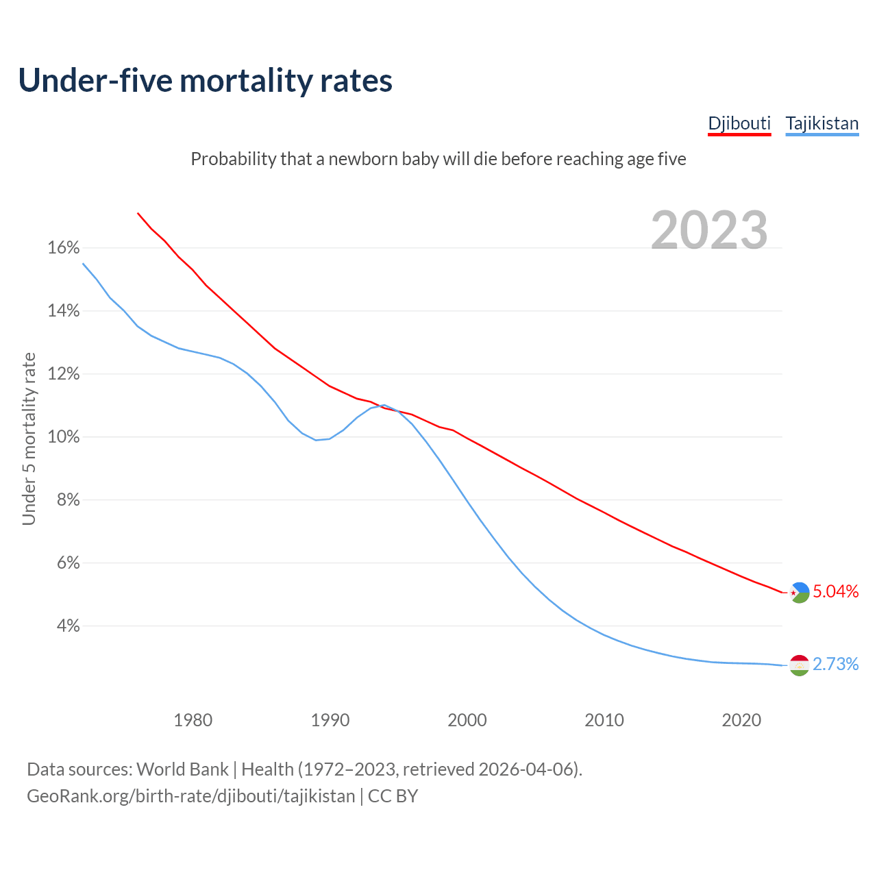 The chance that a newborn baby will die before reaching age five is 5.04% in Djibouti and 2.73% in Tajikistan. Above is a chart with historical data on under-five mortality rates.