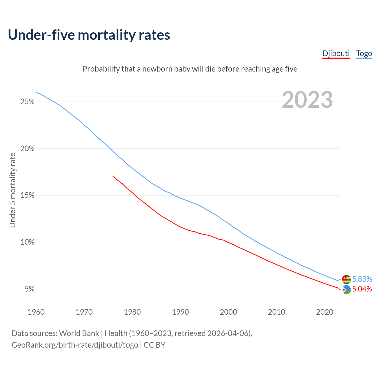 The chance that a newborn baby will die before reaching age five is 5.04% in Djibouti and 5.83% in Togo. Above is a chart with historical data on under-five mortality rates.