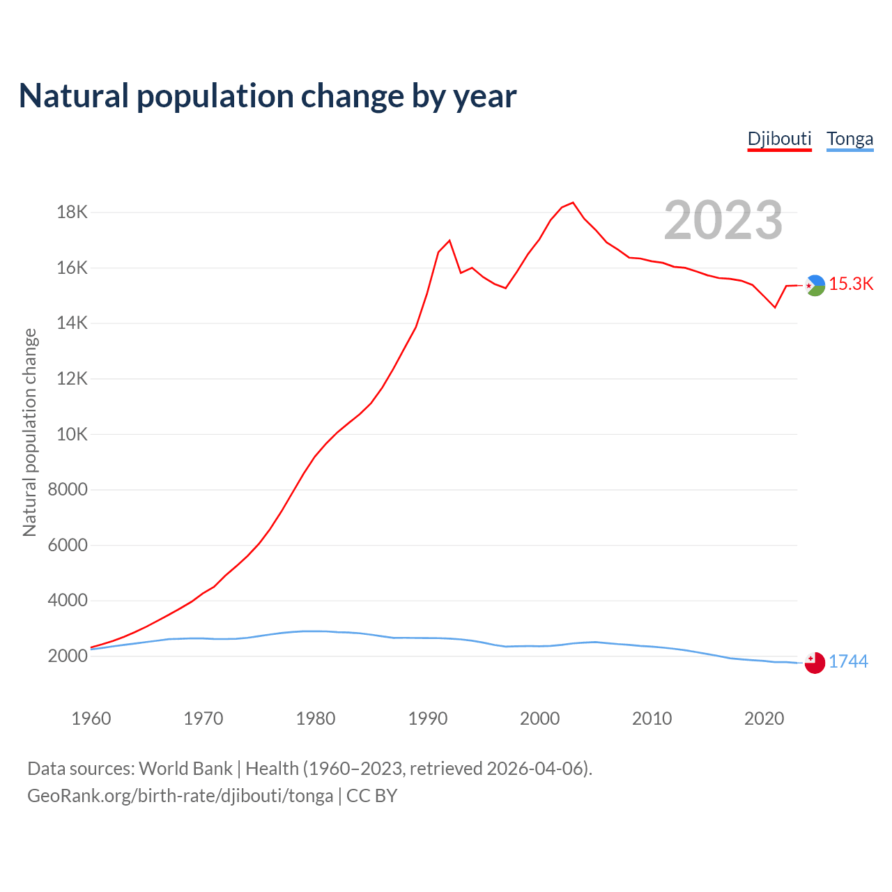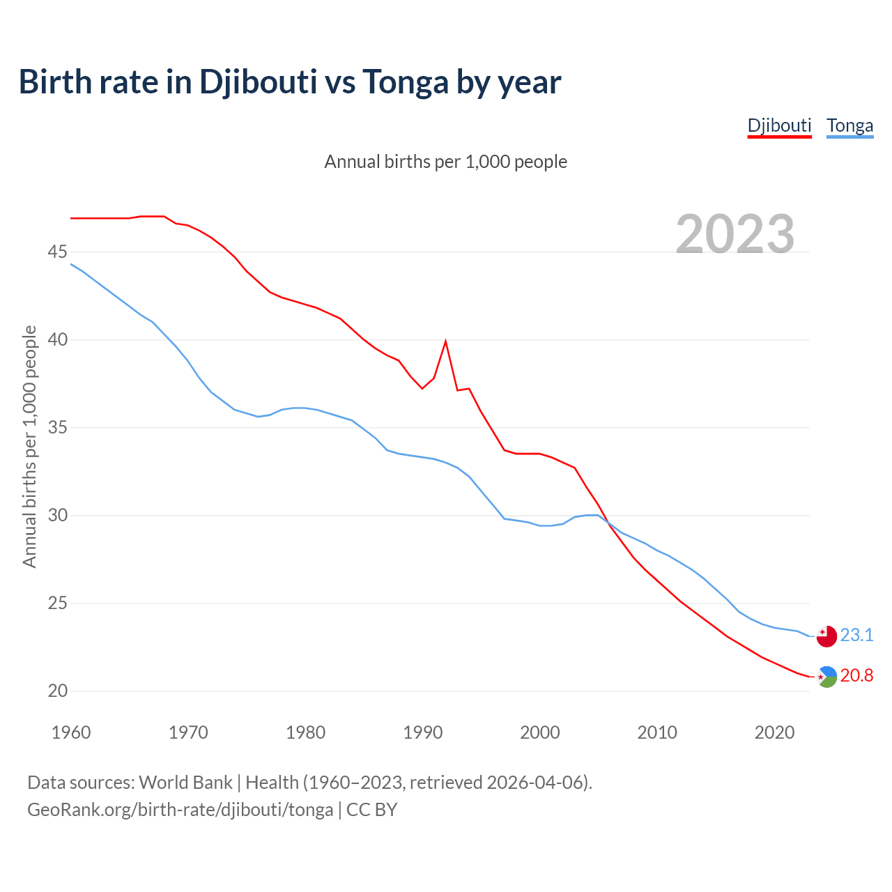 Djibouti has an annual birth rate of 20.8 births per 1,000 people, compared to 23.1 for Tonga. The average number of children a woman is expected to have during her lifetime — the fertility rate, is 2.61 in Djibouti and 3.13 in Tonga — 19.9% difference.