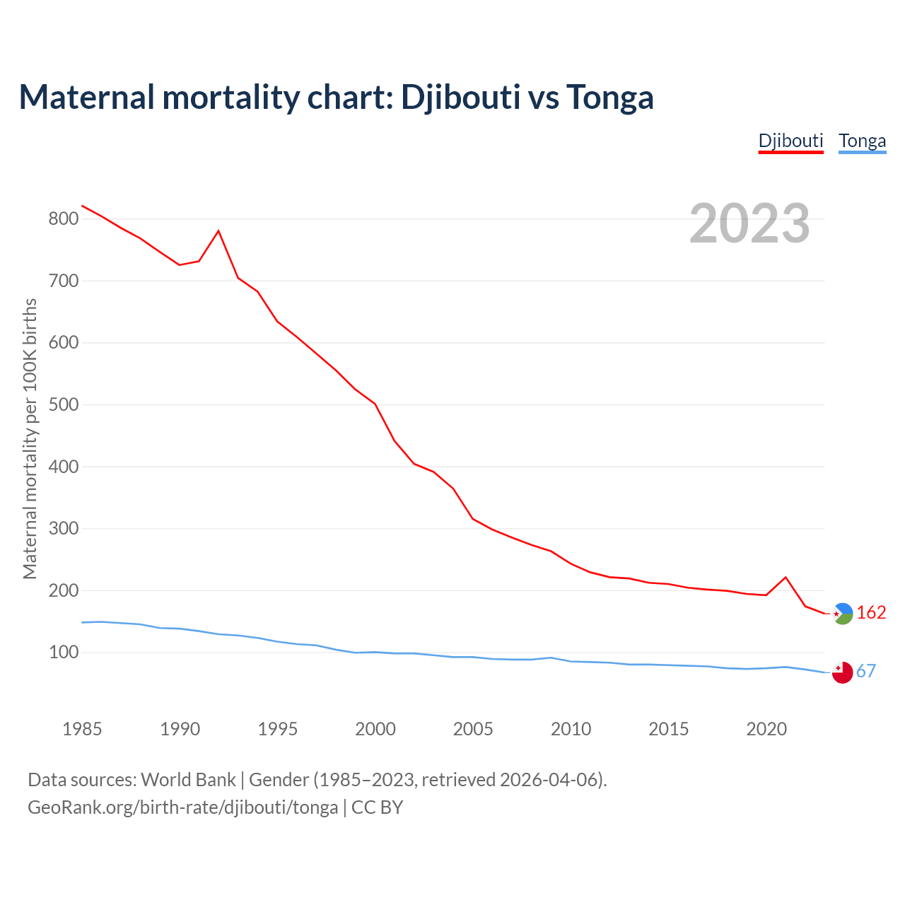 The maternal mortality rate, which is the probability of dying during childbirth or within 42 days of pregnancy termination, is 162 deaths per 100,000 live births in Djibouti, compared to 67 deaths in Tonga.