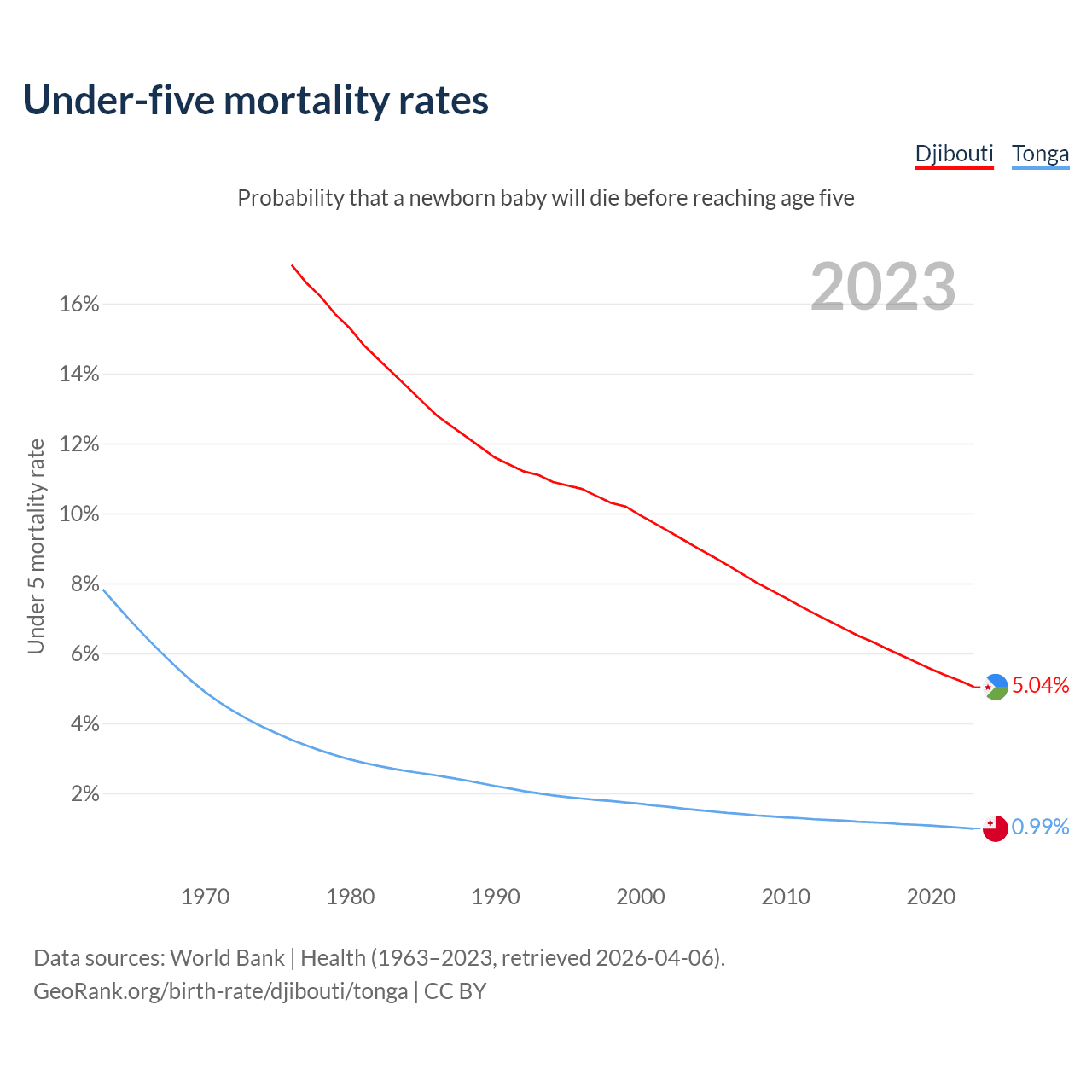The chance that a newborn baby will die before reaching age five is 5.04% in Djibouti and 0.99% in Tonga. Above is a chart with historical data on under-five mortality rates.