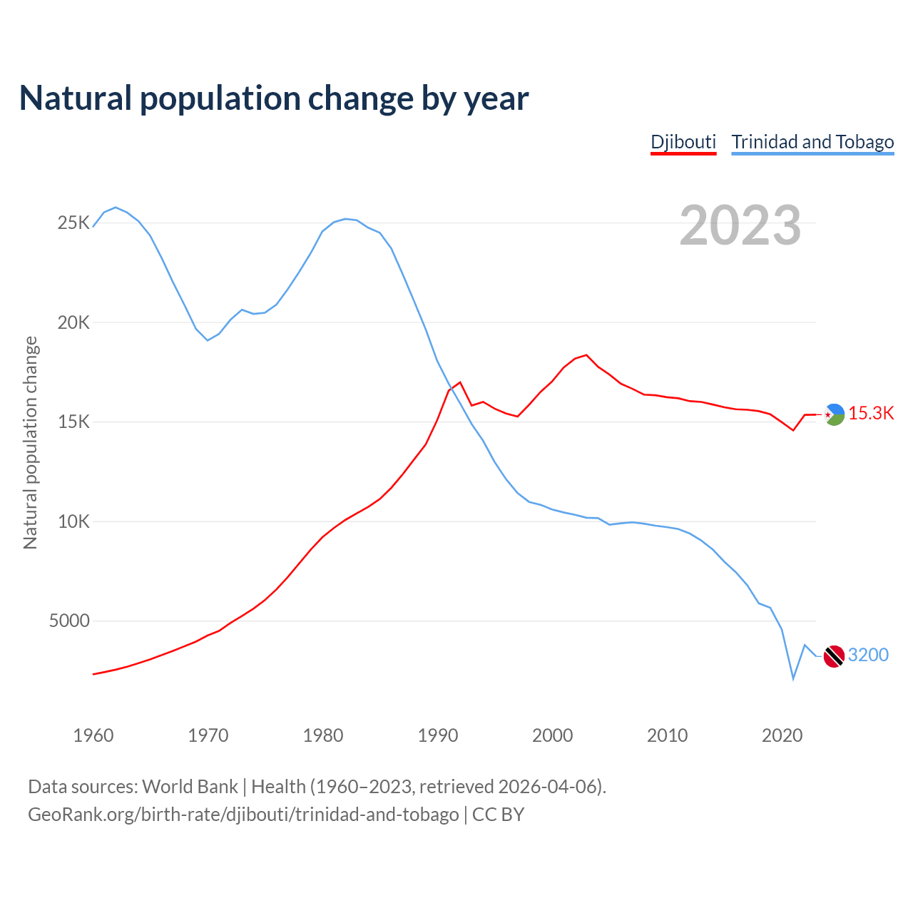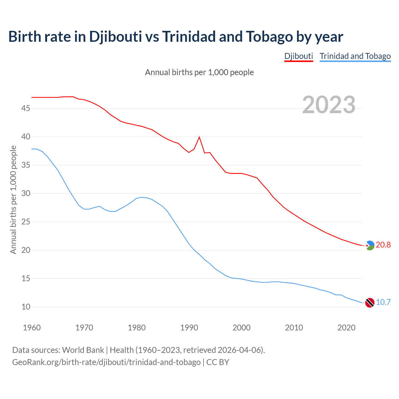 Djibouti has an annual birth rate of 20.8 births per 1,000 people, compared to 10.7 for Trinidad and Tobago. The average number of children a woman is expected to have during her lifetime — the fertility rate, is 2.61 in Djibouti and 1.53 in Trinidad and Tobago — 41.3% difference.