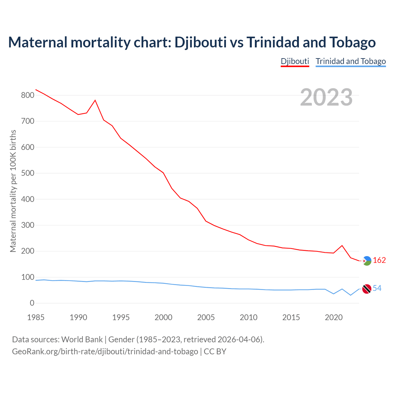 The maternal mortality rate, which is the probability of dying during childbirth or within 42 days of pregnancy termination, is 162 deaths per 100,000 live births in Djibouti, compared to 54 deaths in Trinidad and Tobago.