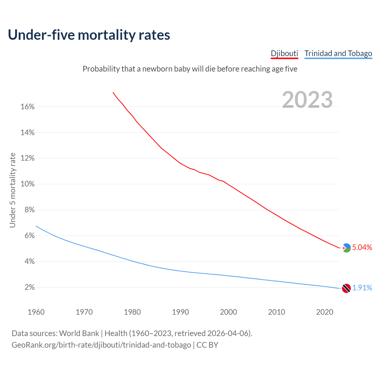 The chance that a newborn baby will die before reaching age five is 5.04% in Djibouti and 1.91% in Trinidad and Tobago. Above is a chart with historical data on under-five mortality rates.