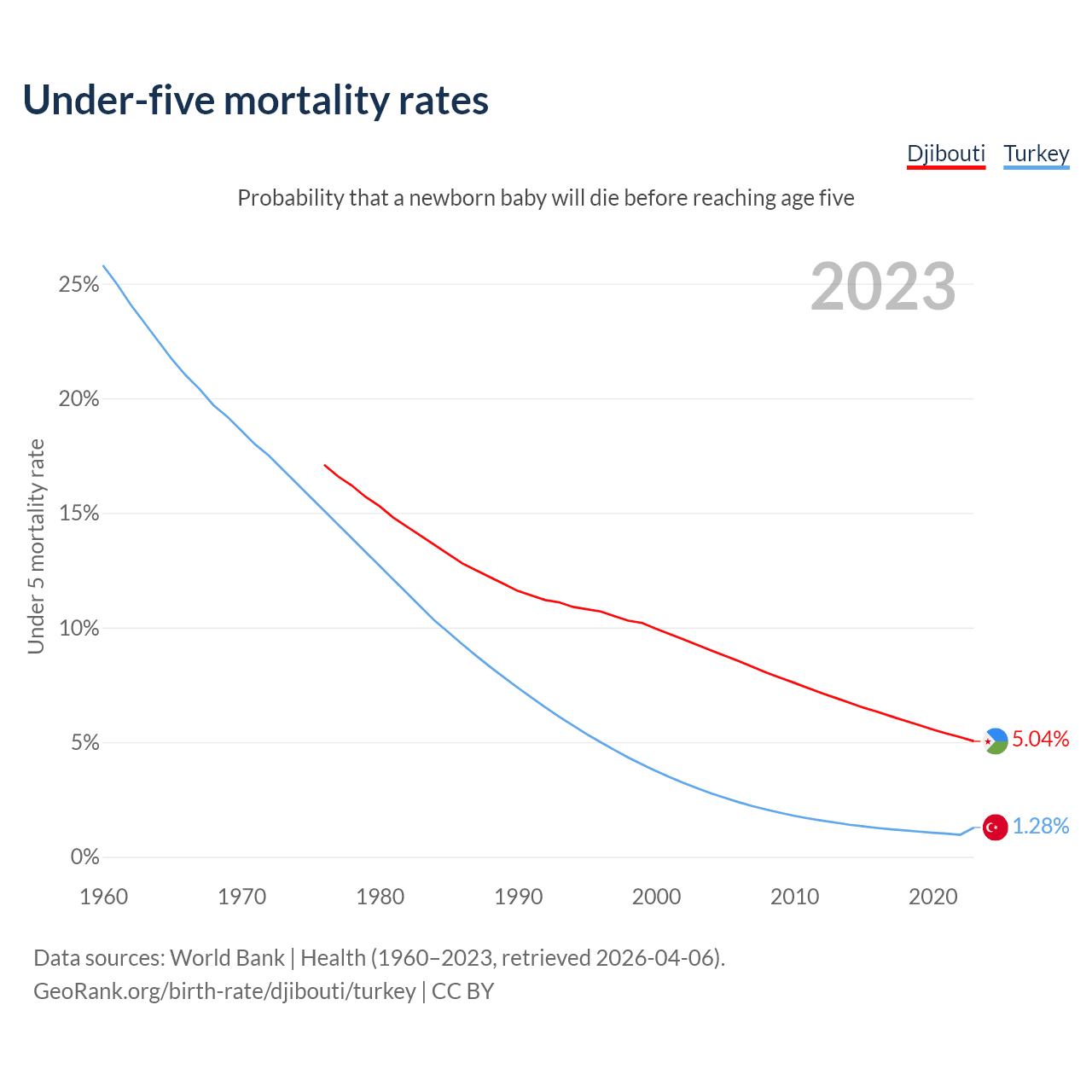 The chance that a newborn baby will die before reaching age five is 5.04% in Djibouti and 1.28% in Turkey. Above is a chart with historical data on under-five mortality rates.