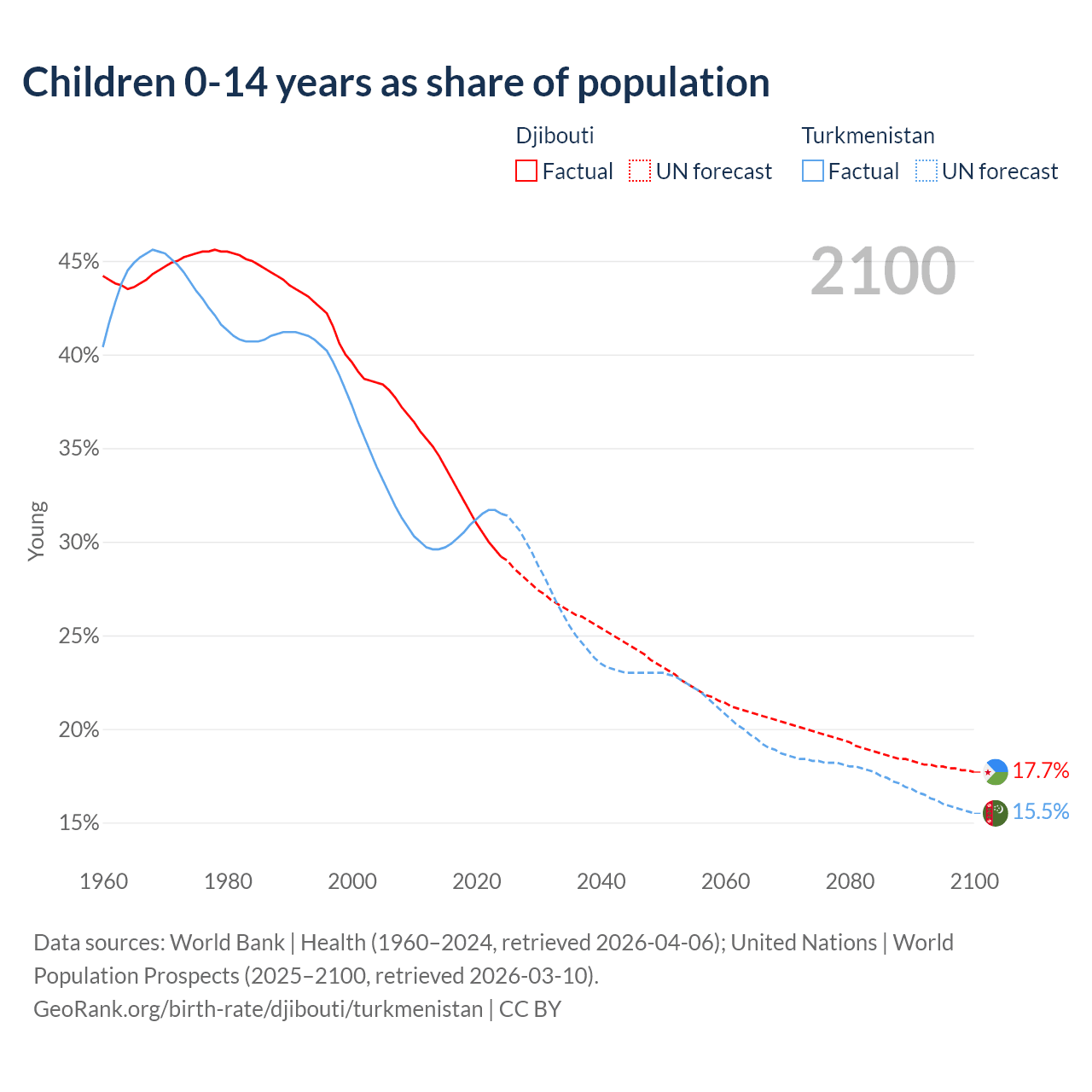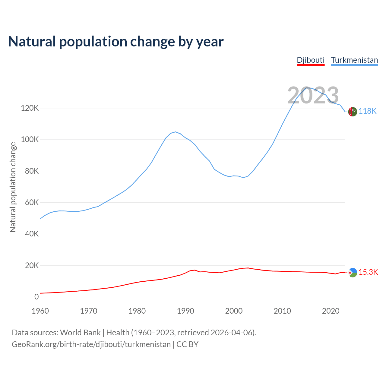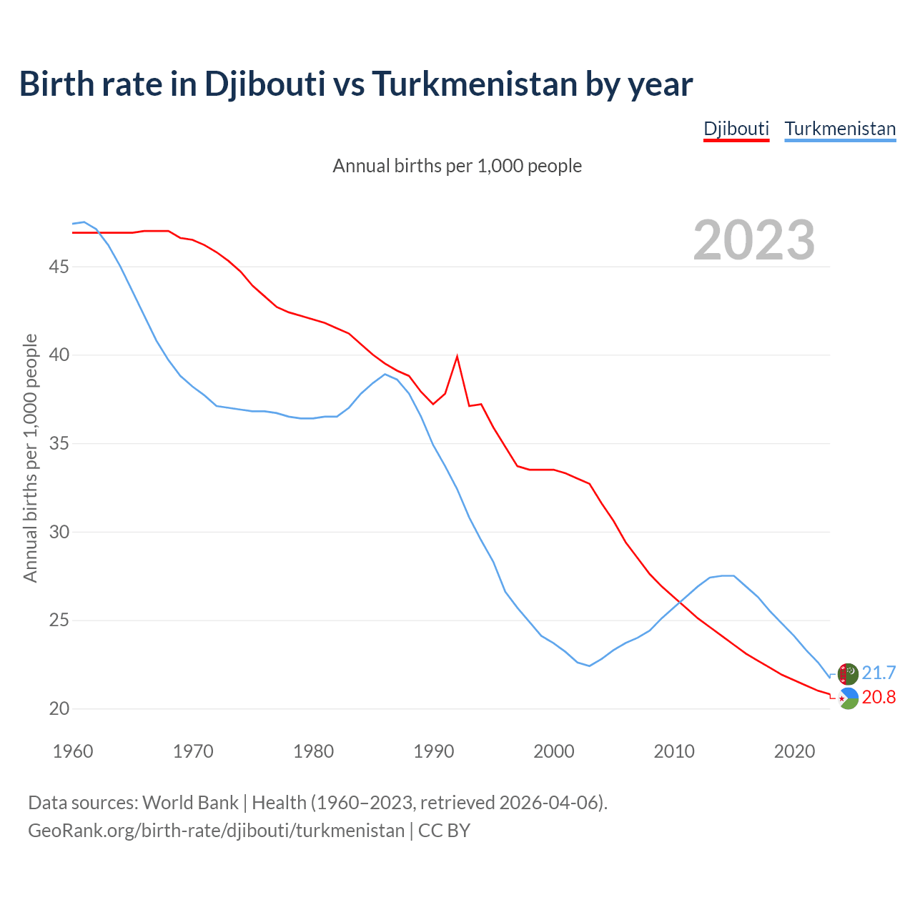 Djibouti has an annual birth rate of 20.8 births per 1,000 people, compared to 21.7 for Turkmenistan. The average number of children a woman is expected to have during her lifetime — the fertility rate, is 2.61 in Djibouti and 2.69 in Turkmenistan — 3.1% difference.