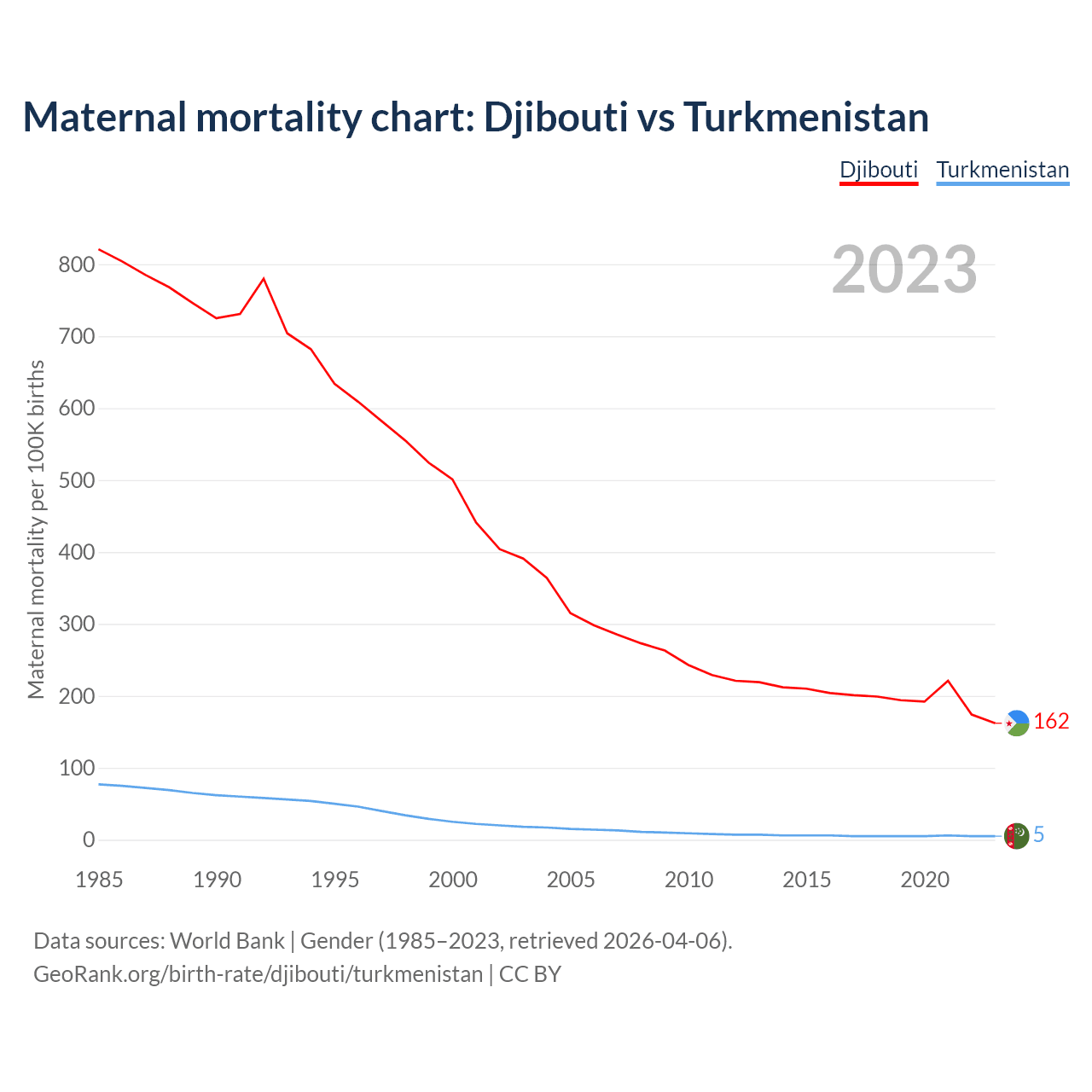 The maternal mortality rate, which is the probability of dying during childbirth or within 42 days of pregnancy termination, is 162 deaths per 100,000 live births in Djibouti, compared to 5 deaths in Turkmenistan.