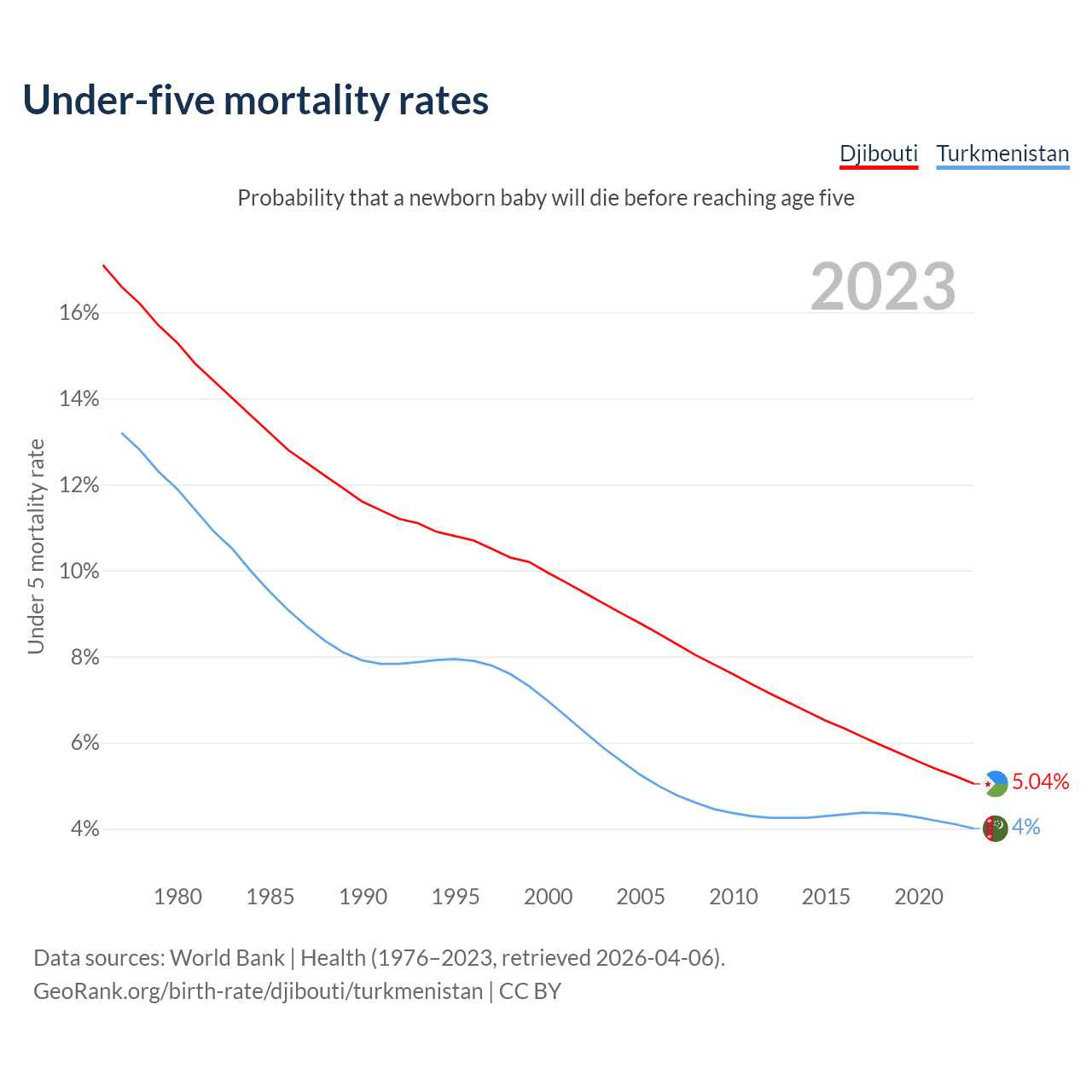 The chance that a newborn baby will die before reaching age five is 5.04% in Djibouti and 4% in Turkmenistan. Above is a chart with historical data on under-five mortality rates.