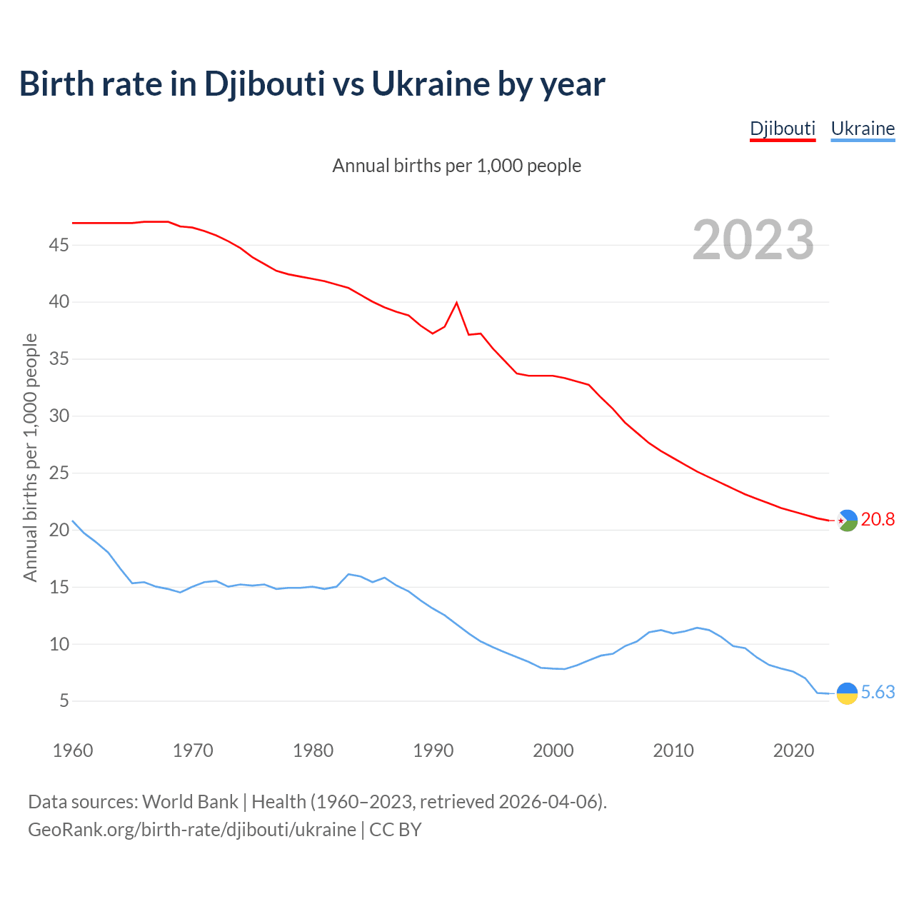 Djibouti has an annual birth rate of 20.8 births per 1,000 people, compared to 5.63 for Ukraine. The average number of children a woman is expected to have during her lifetime — the fertility rate, is 2.61 in Djibouti and 0.98 in Ukraine — 62.6% difference.