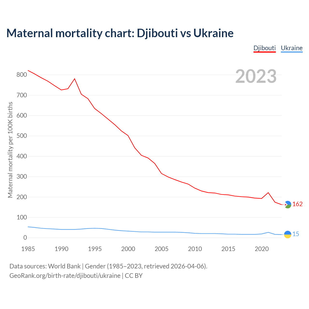 The maternal mortality rate, which is the probability of dying during childbirth or within 42 days of pregnancy termination, is 162 deaths per 100,000 live births in Djibouti, compared to 15 deaths in Ukraine.