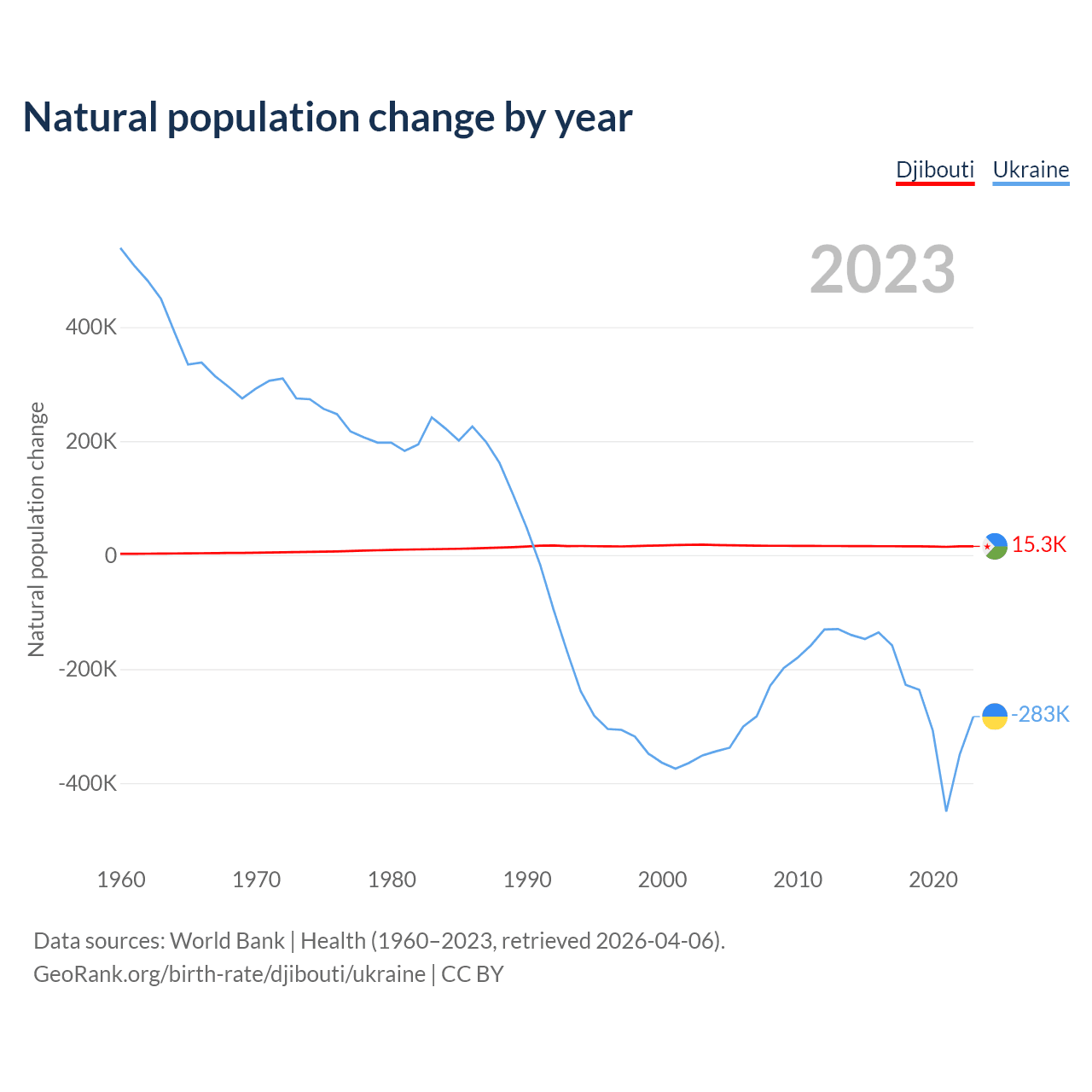 According to the latest available data on birth rates, the fertility rate in Djibouti was 2.61 children per woman in 2023, compared to 0.98 in Ukraine in 2023. The replacement level is considered to be 2.1 children per woman.