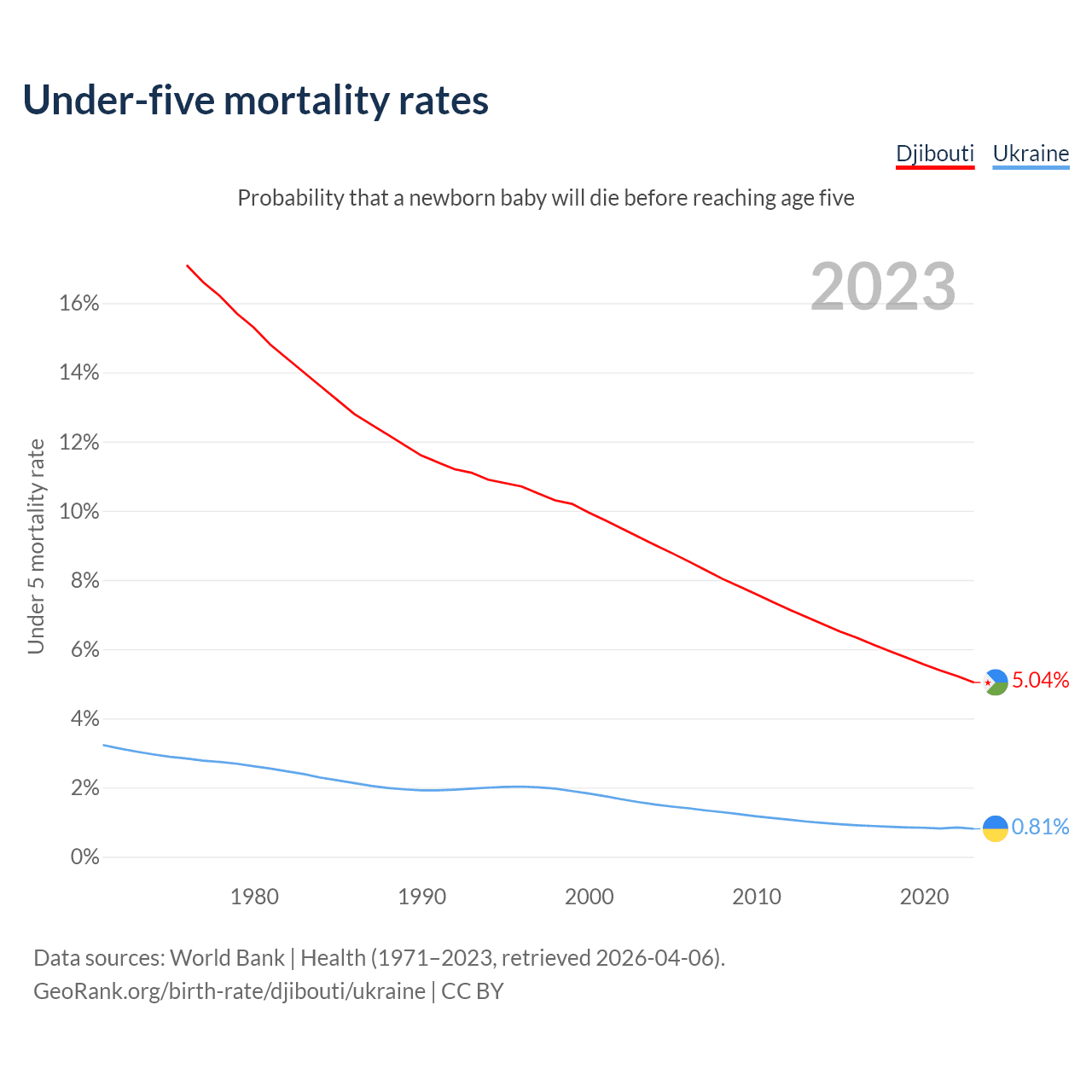 The chance that a newborn baby will die before reaching age five is 5.04% in Djibouti and 0.81% in Ukraine. Above is a chart with historical data on under-five mortality rates.