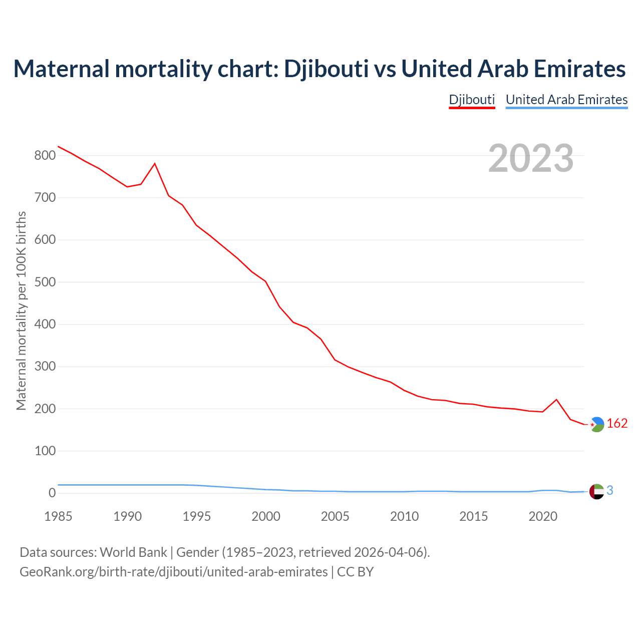 The maternal mortality rate, which is the probability of dying during childbirth or within 42 days of pregnancy termination, is 162 deaths per 100,000 live births in Djibouti, compared to 3 deaths in the United Arab Emirates.