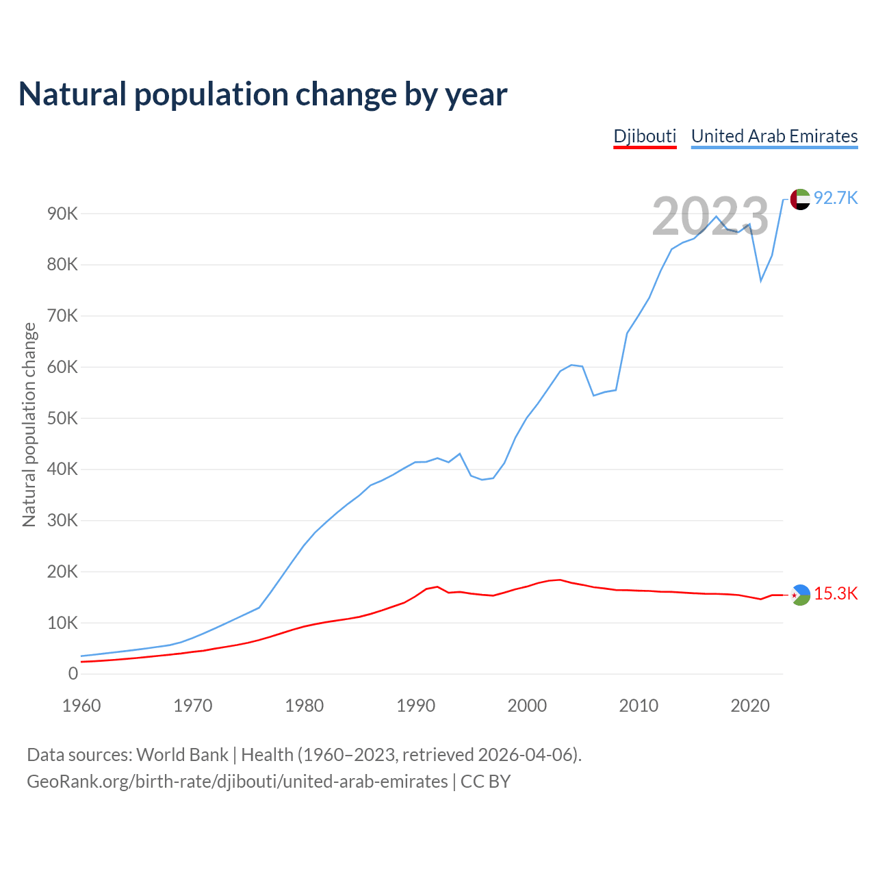 Djibouti has an annual birth rate of 20.8 births per 1,000 people, compared to 9.77 for the United Arab Emirates. The average number of children a woman is expected to have during her lifetime — the fertility rate, is 2.61 in Djibouti and 1.2 in the United Arab Emirates — 54% difference.