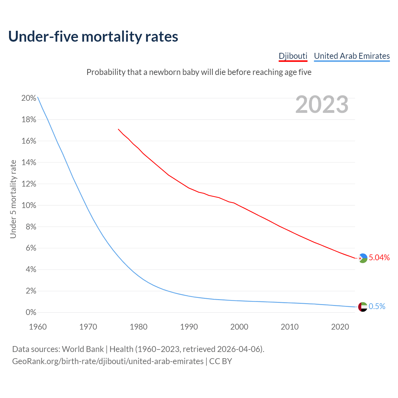 The chance that a newborn baby will die before reaching age five is 5.04% in Djibouti and 0.5% in the United Arab Emirates. Above is a chart with historical data on under-five mortality rates.