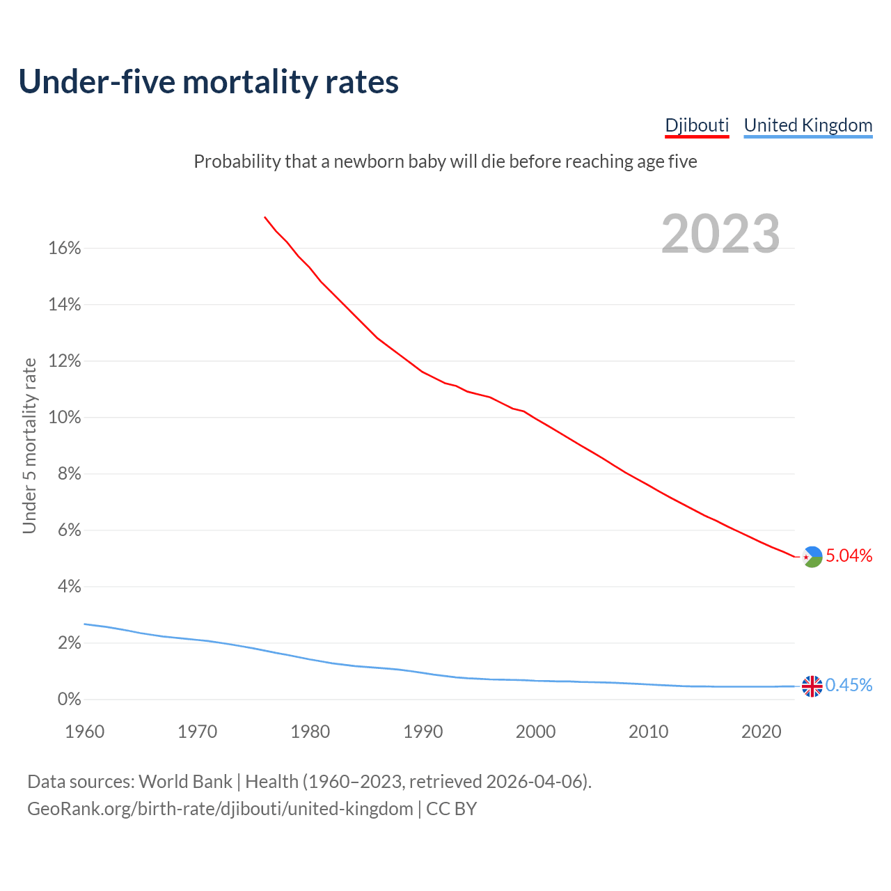The chance that a newborn baby will die before reaching age five is 5.04% in Djibouti and 0.45% in the United Kingdom. Above is a chart with historical data on under-five mortality rates.