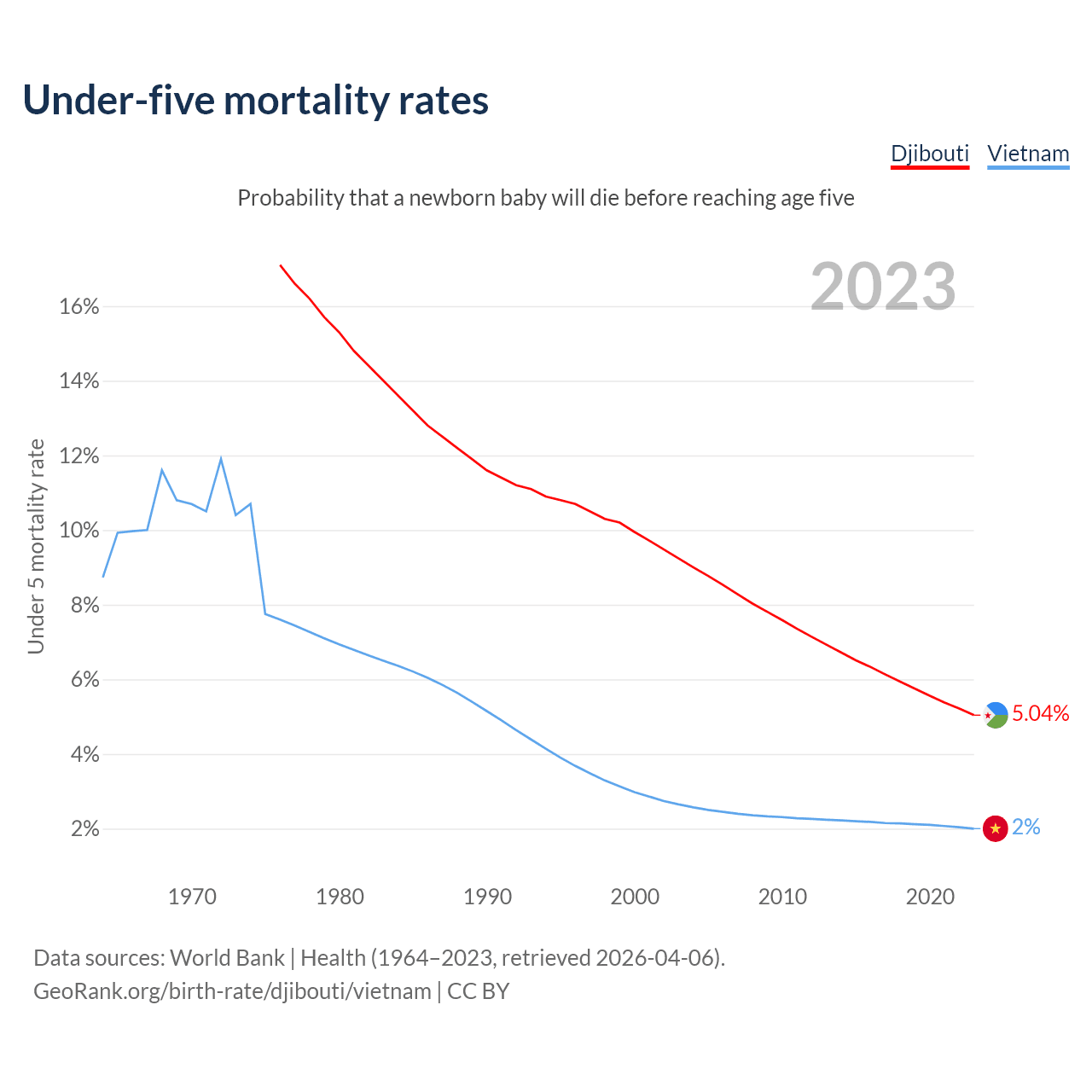 The chance that a newborn baby will die before reaching age five is 5.04% in Djibouti and 2% in Vietnam. Above is a chart with historical data on under-five mortality rates.
