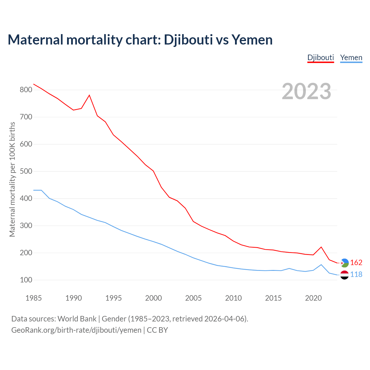The maternal mortality rate, which is the probability of dying during childbirth or within 42 days of pregnancy termination, is 162 deaths per 100,000 live births in Djibouti, compared to 118 deaths in Yemen.