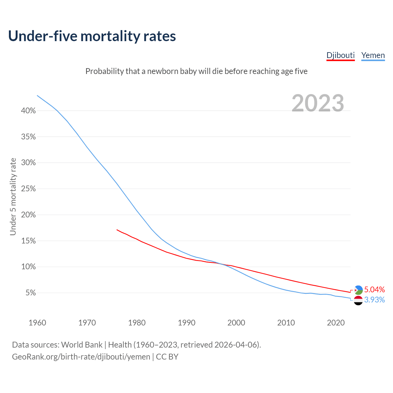 The chance that a newborn baby will die before reaching age five is 5.04% in Djibouti and 3.93% in Yemen. Above is a chart with historical data on under-five mortality rates.