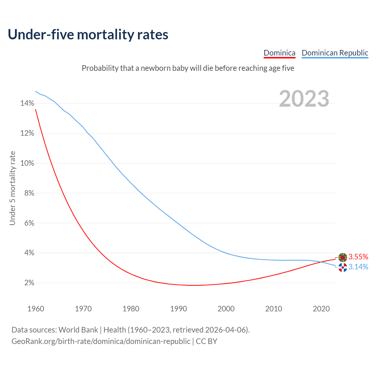 The chance that a newborn baby will die before reaching age five is 3.55% in Dominica and 3.14% in the Dominican Republic. Above is a chart with historical data on under-five mortality rates.