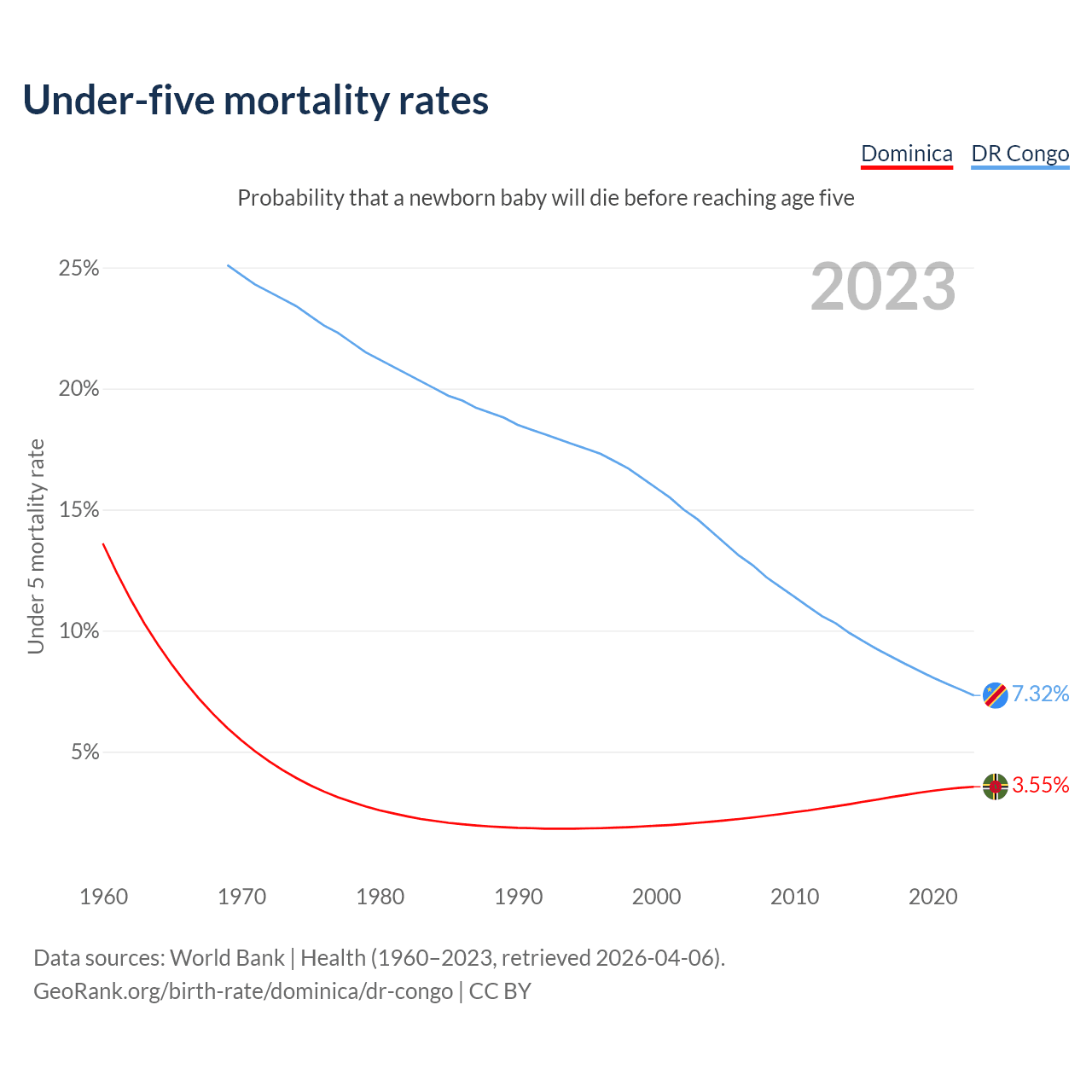 The chance that a newborn baby will die before reaching age five is 3.55% in Dominica and 7.32% in the DR Congo. Above is a chart with historical data on under-five mortality rates.