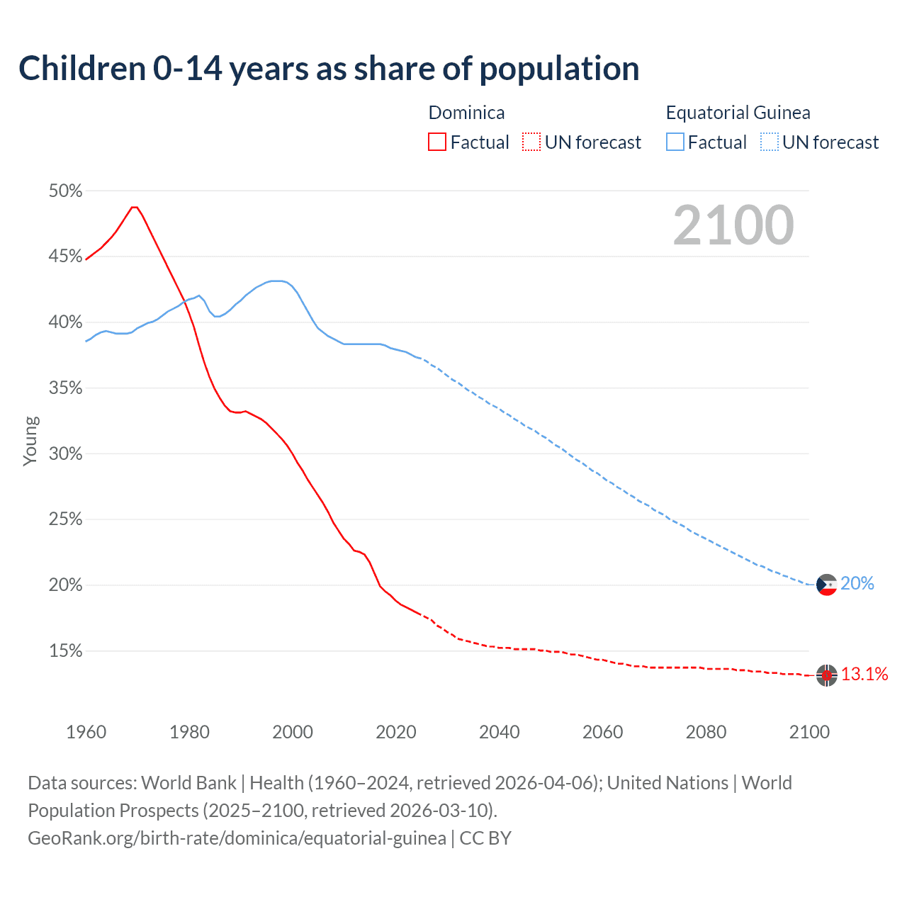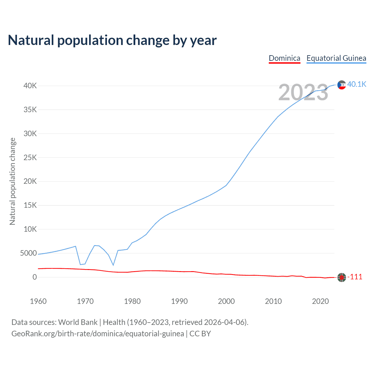 Dominica has an annual birth rate of 11.1 births per 1,000 people, compared to 29.6 for Equatorial Guinea. The average number of children a woman is expected to have during her lifetime — the fertility rate, is 1.48 in Dominica and 4.08 in Equatorial Guinea — 175% difference.